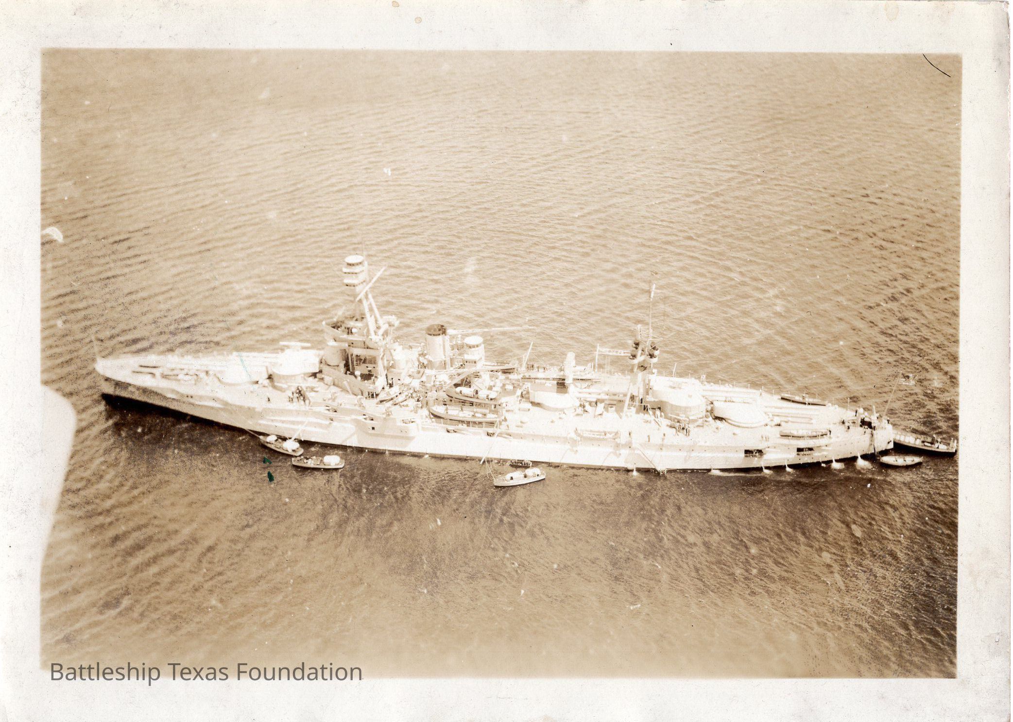 Port side of ship visible from air. Multiple smaller craft against the hull. No land. Back says "USS Texas 1935"Context