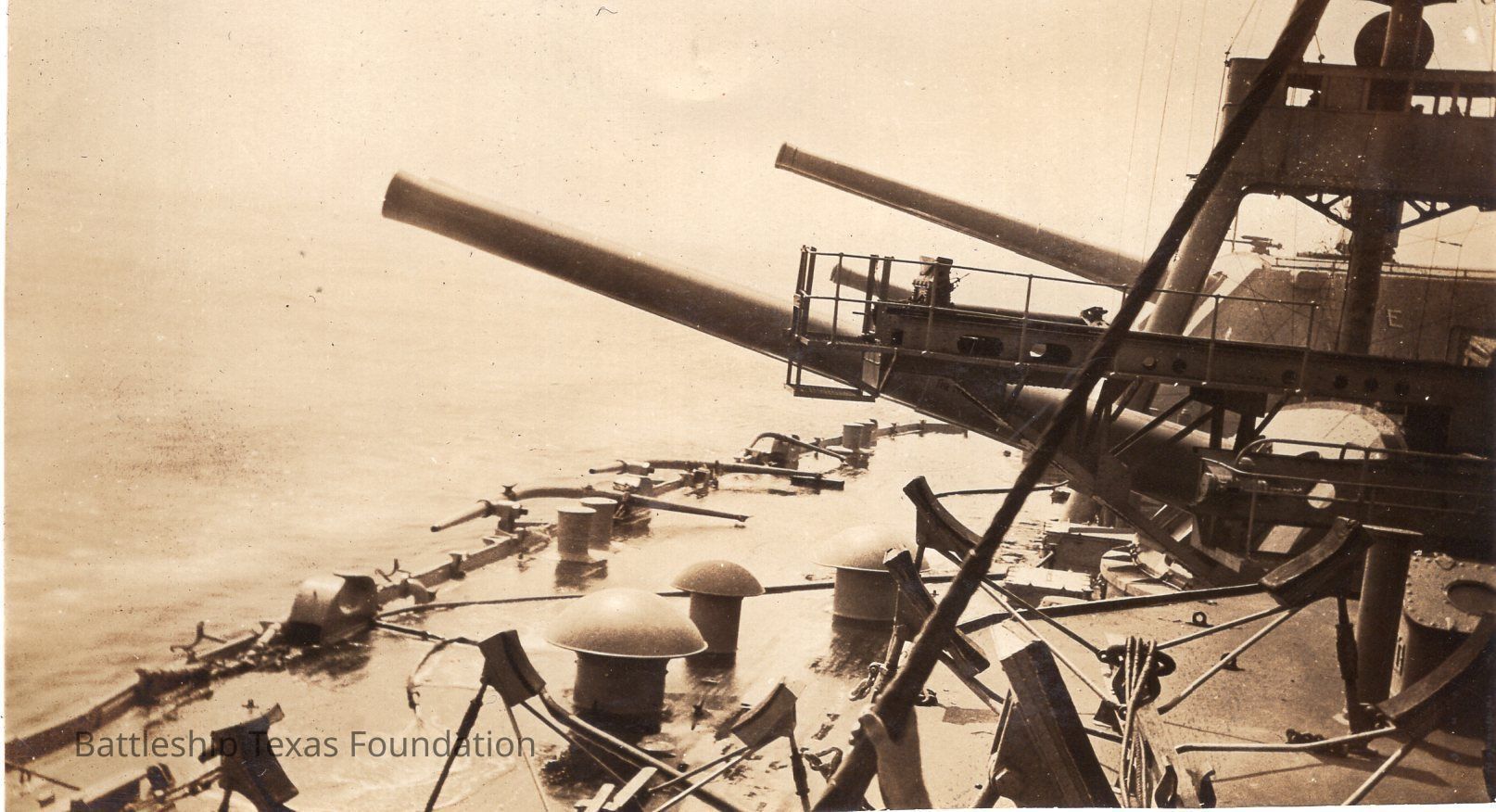 Features turrets 4 & 5 turned to starboard and pitched at near max angle. Catapult visible in foreground.Context