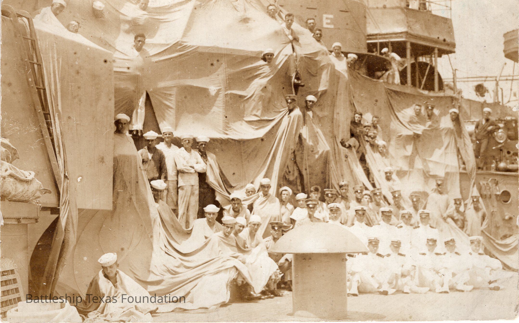 Dozens of sailors resting on the portside forward of the air castle. Sheet covering turrets and lower superstructure.Context