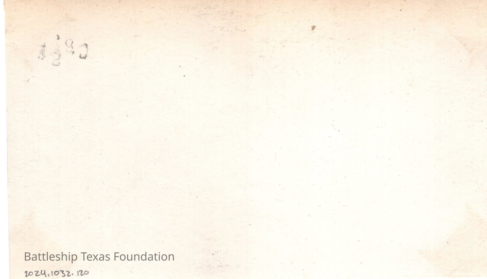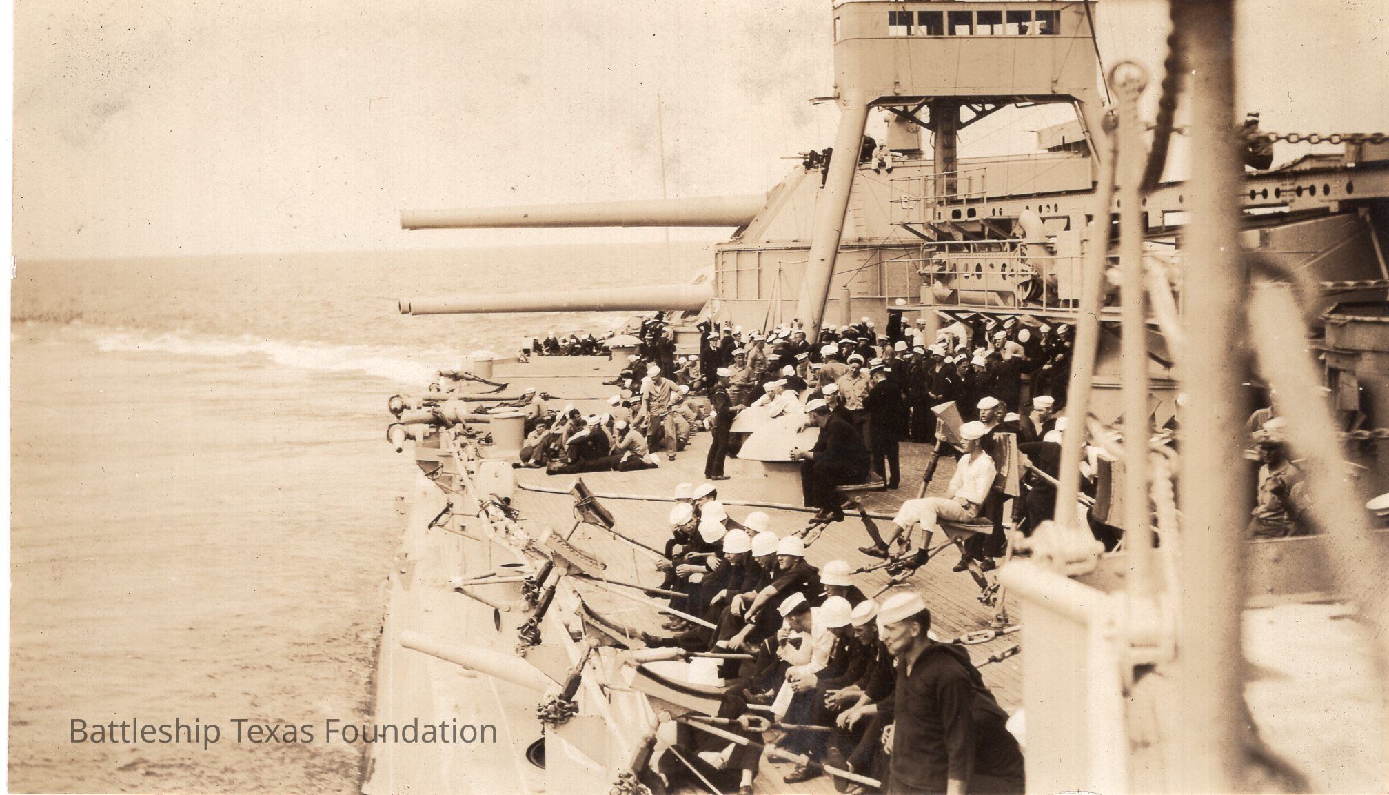 From a donated collection of individual photographs and pages out of a Texas crewmember's photo album. Items donated by the Los Angeles Maritime Museum. Many photographs had writing on the pages of the book, now discarded. The caption formerly on the page for this photo read, "AFTER,DECKS BEFORE SHORT RANGE"