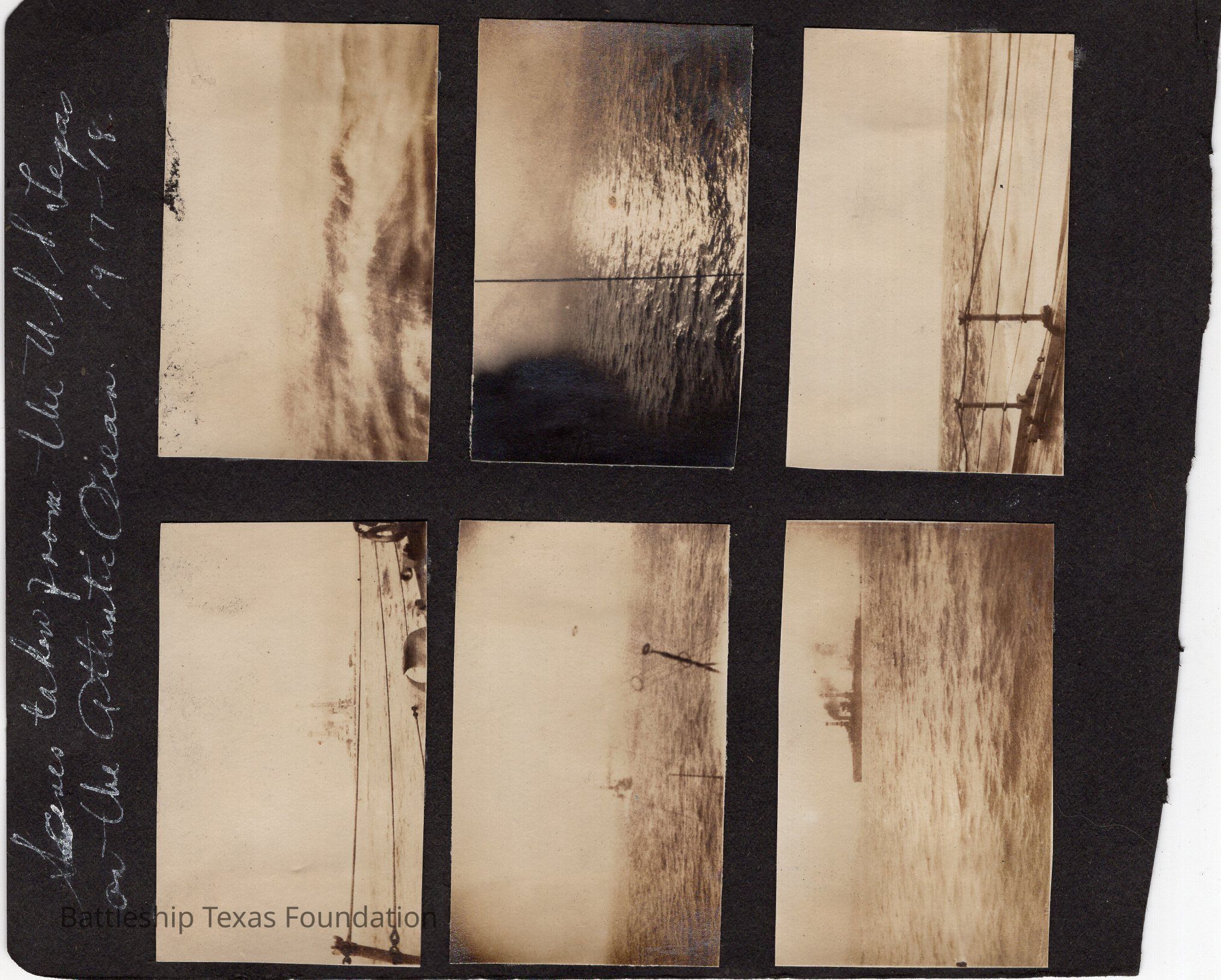 Six photos on the front side, two missing on the back. Front is of shots of the ocean off main deck. Top of page captioned