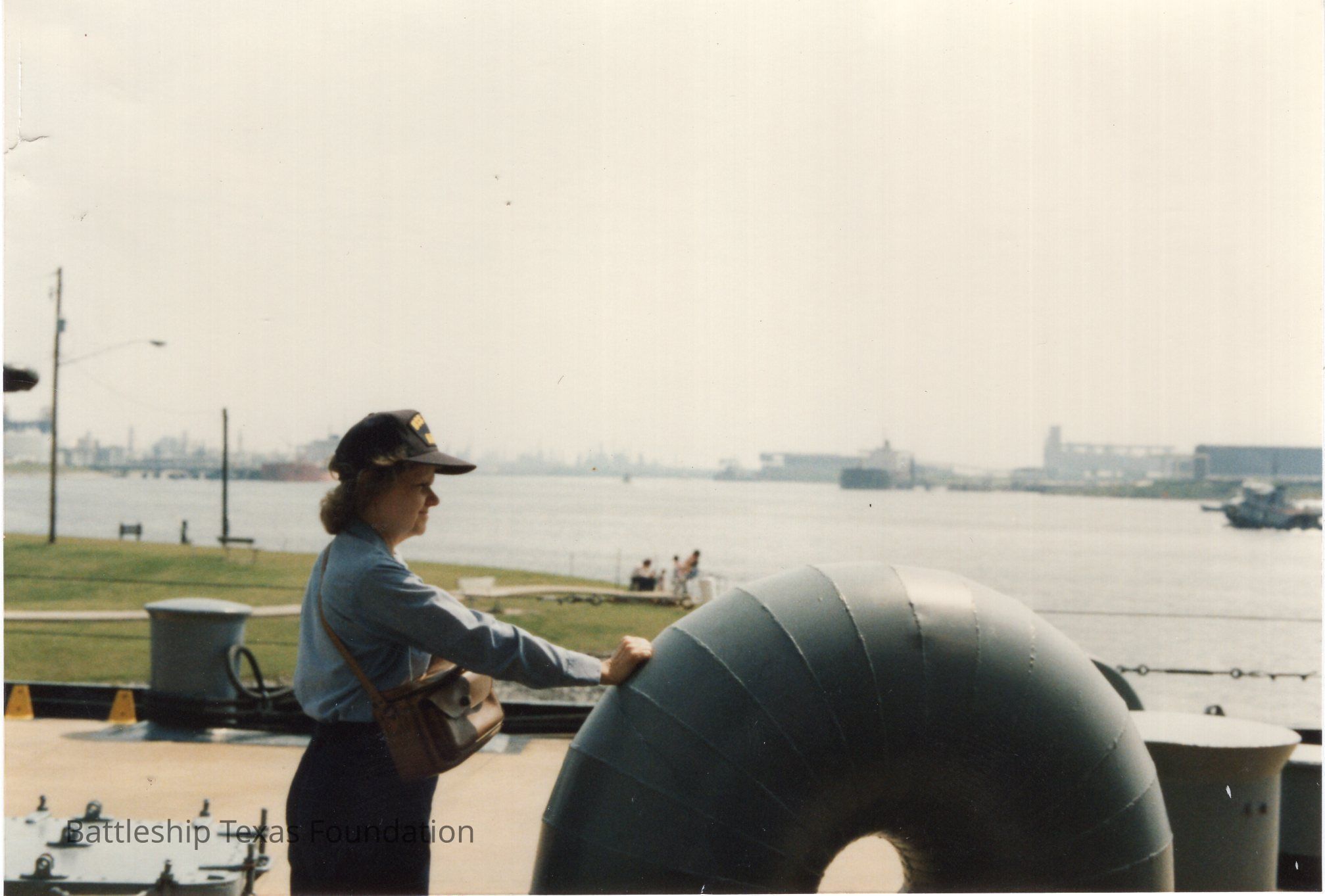 Alita Morrison (wife of Ed) standing on main deck with Houston Ship Channel in the background.Context