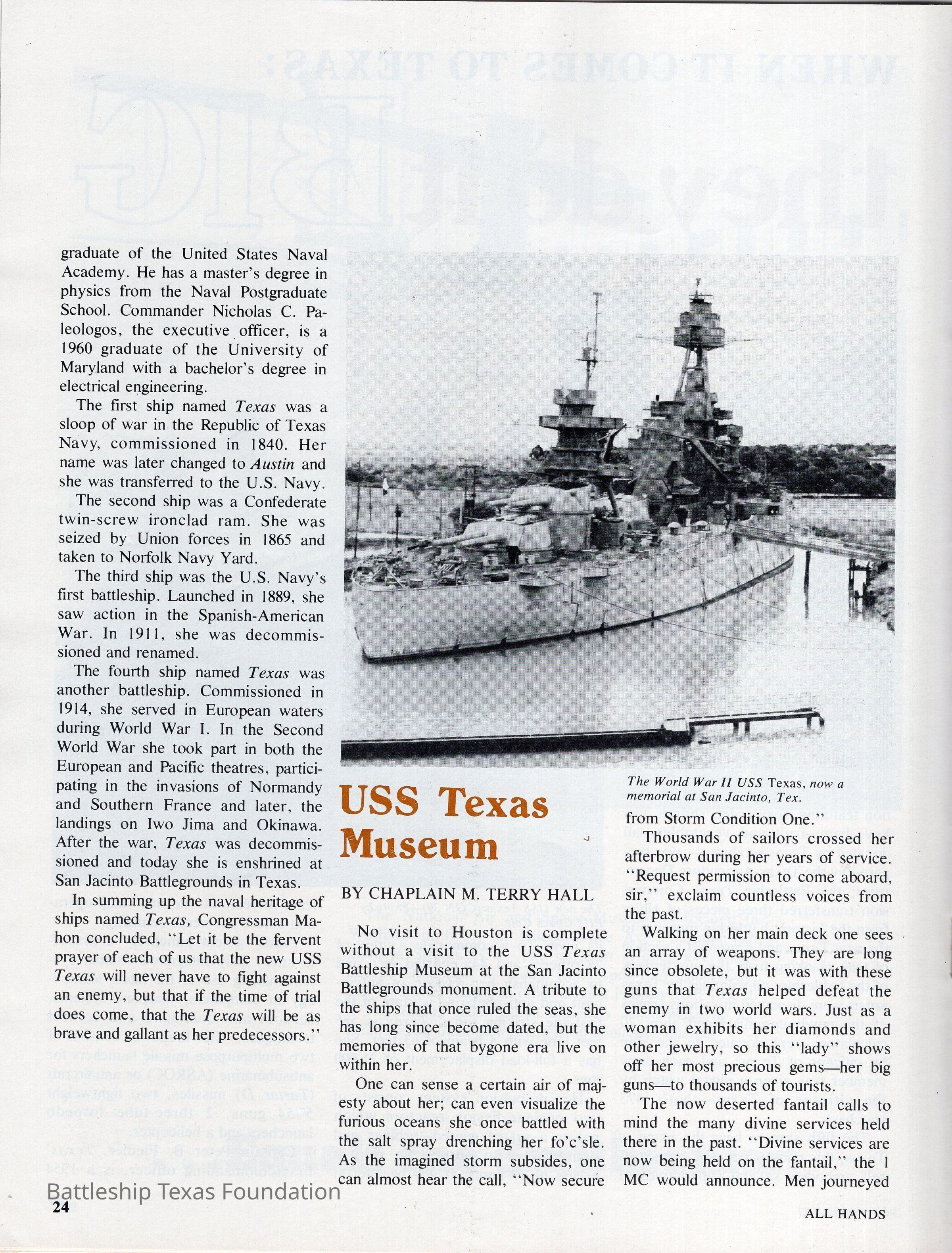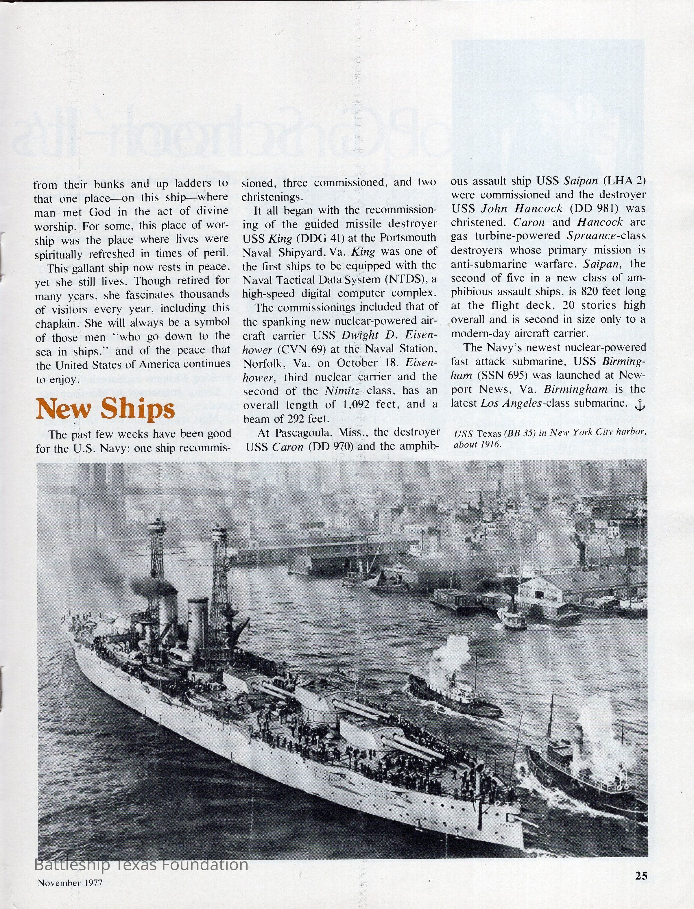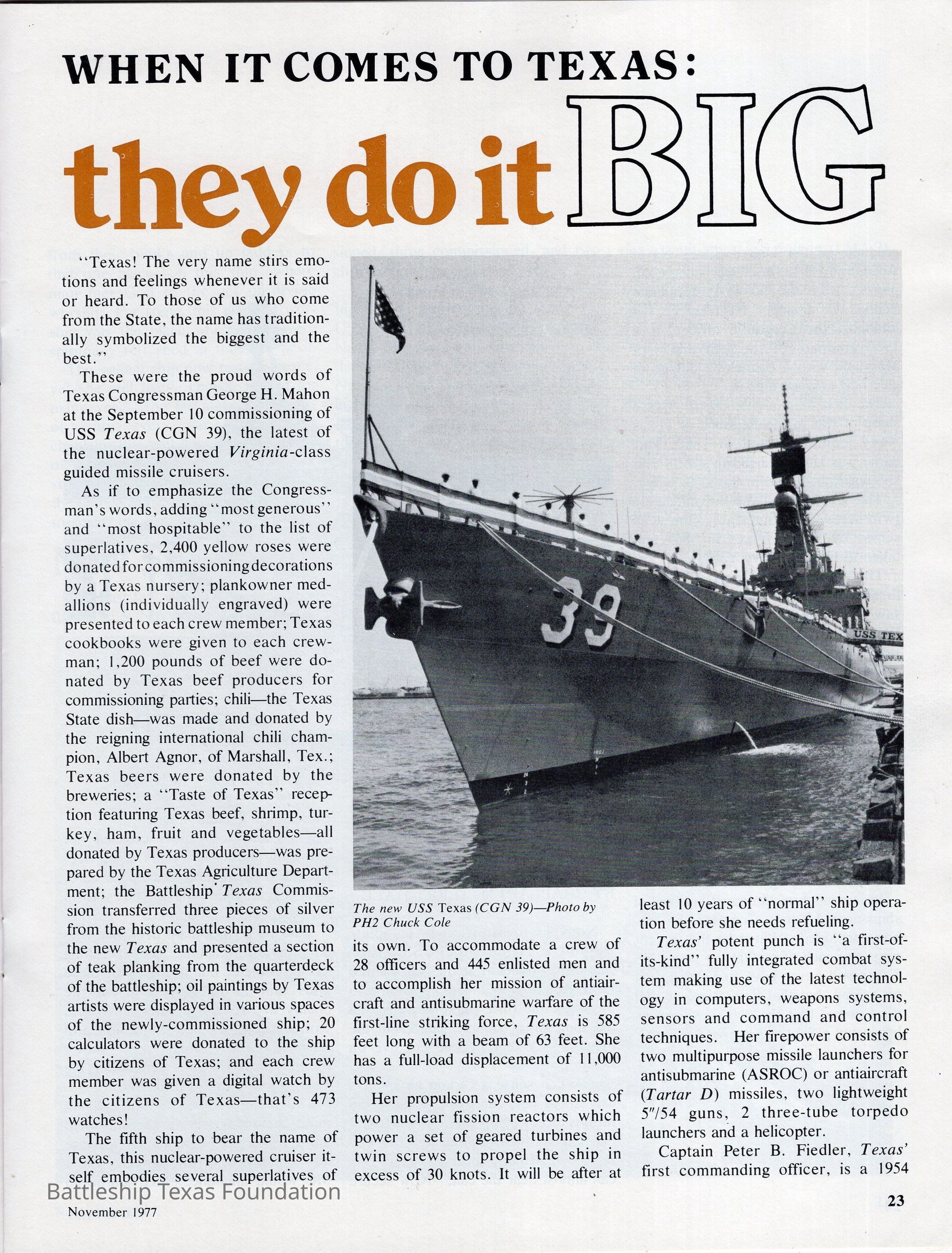 All Hands magazine for November 1977 features a hot air balloon on the cover, and an image of Cruiser Texas on the back. From pages 23-25, there are two articles about USS Texas. The first “When it comes to Texas: They do it Big” is of the new Crusier Texas, and the second “USS Texas Museum” is of the Battleship Texas.Context
