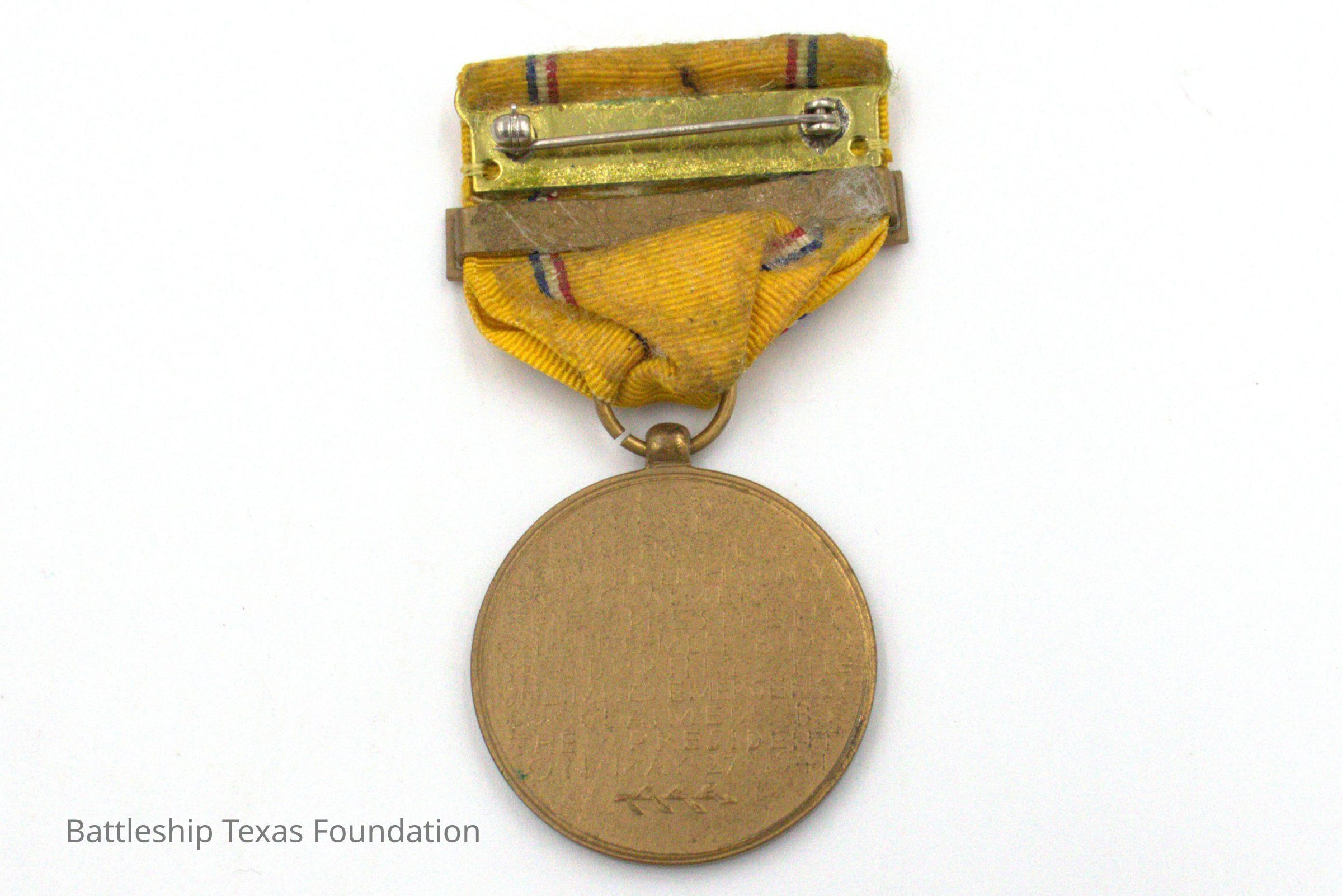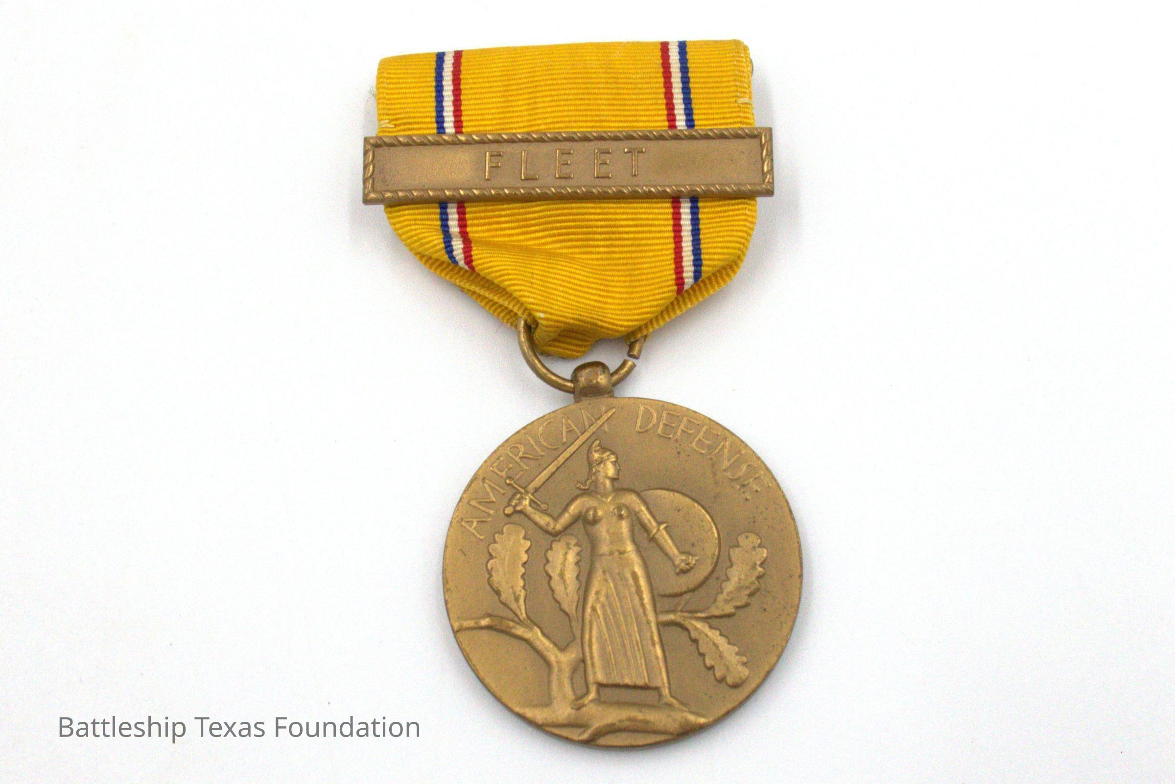 Medal for American defense. Woman with sword and shield, olive branch behind. Yellow fabric with "FLEET" medal bar on it.Context
