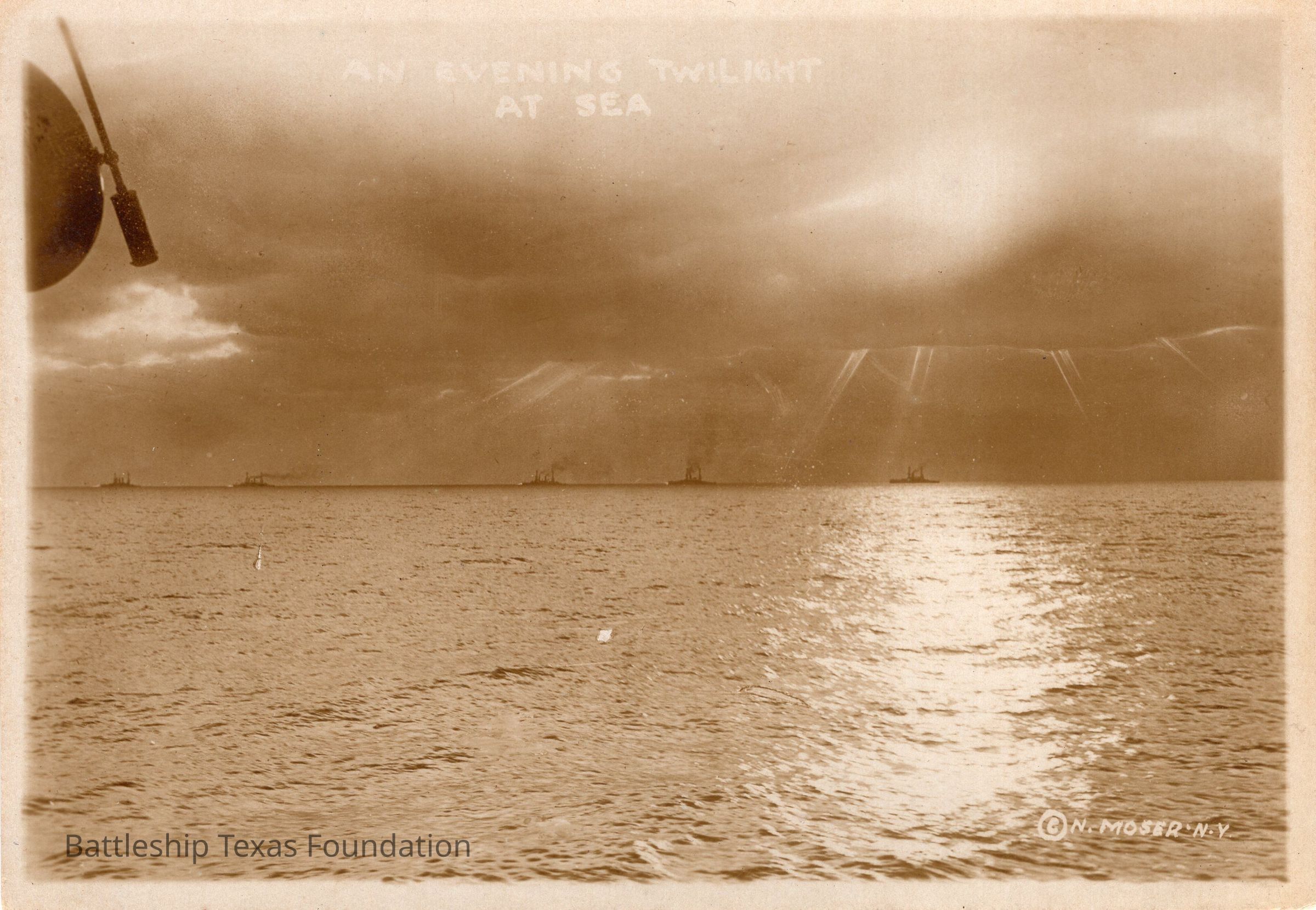 Five battleships steaming to the left of the photograph with sunbeams piercing through the cloud cover.Context