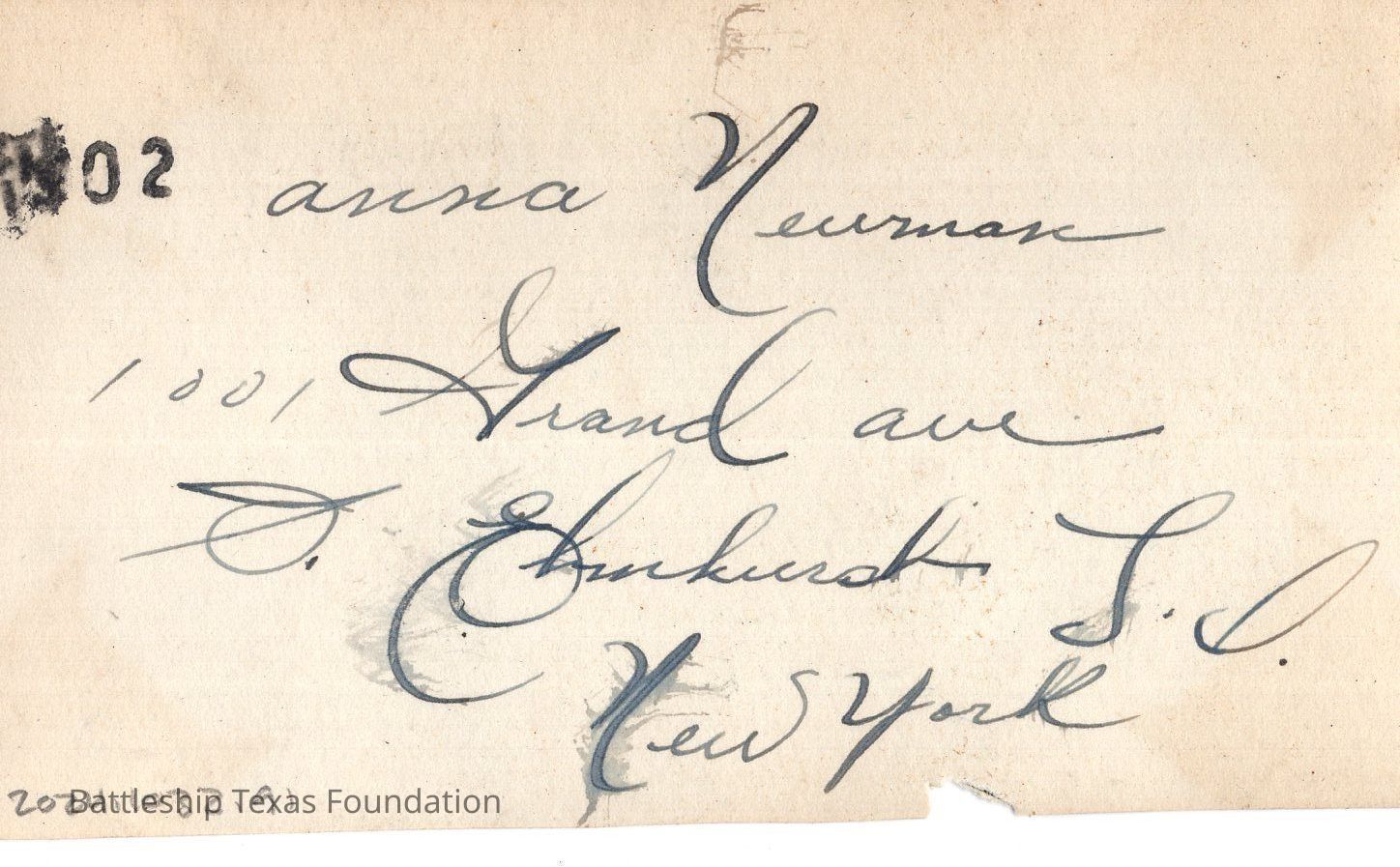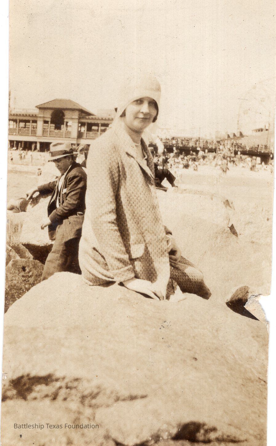 From a donated collection of individual photographs and pages out of a 1930s Texas crewmember's photo album. Items donated by the Los Angeles Maritime Museum. Many photographs had writing on the pages of the book, now discarded. The caption formerly on the page for this photo read, "ANNA NEWMAN"