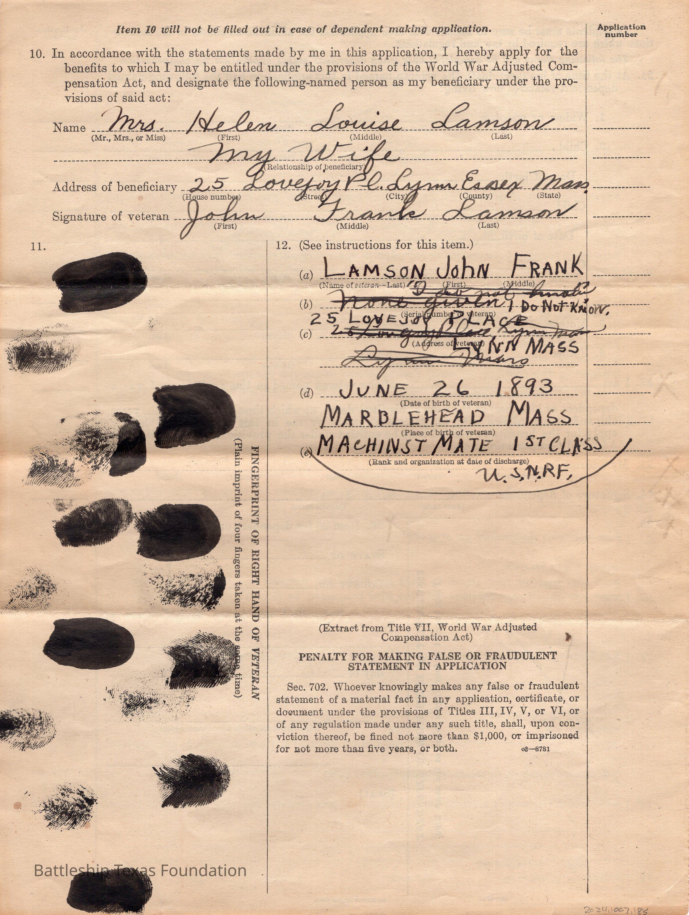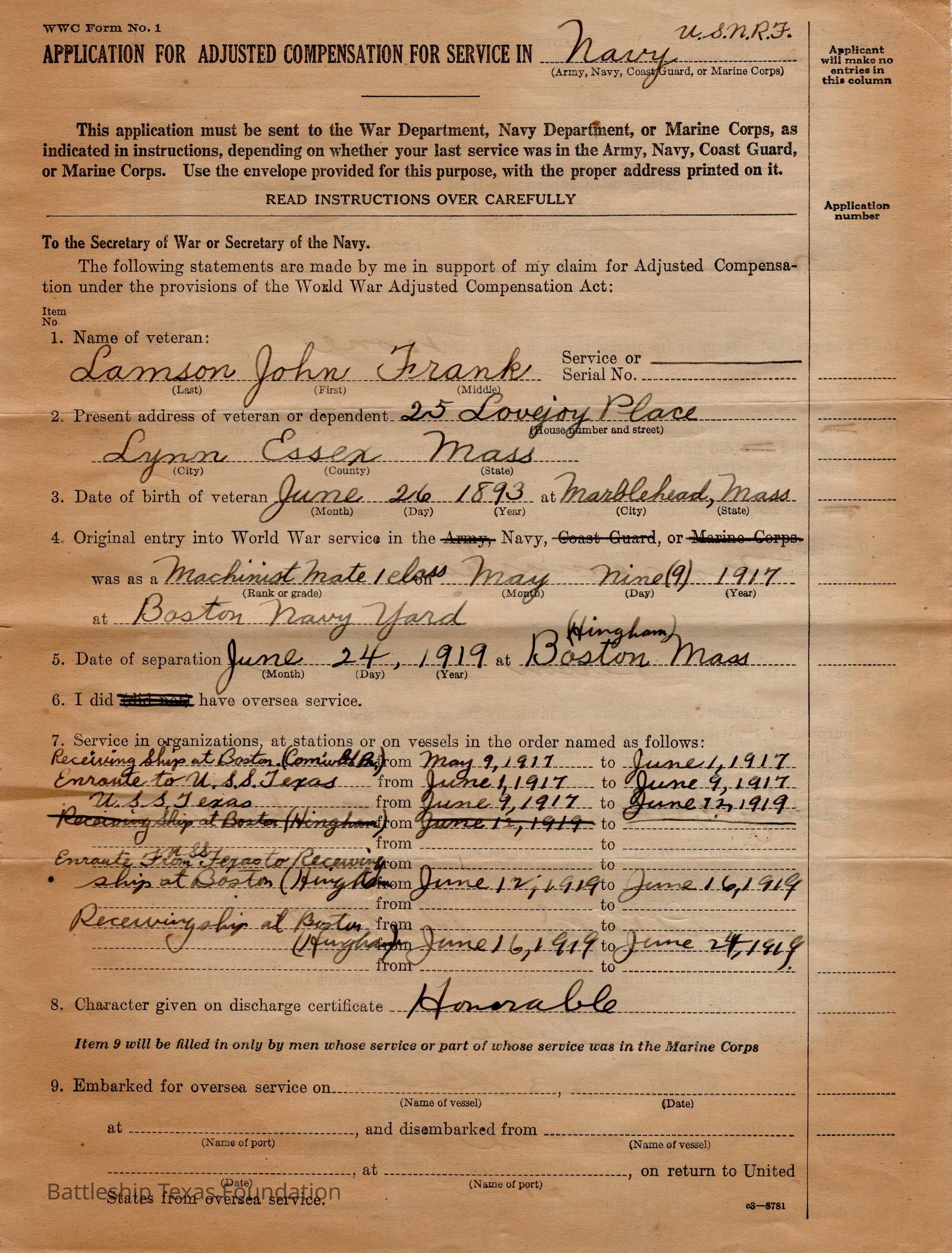John Lamson's application for adjusted compensation for service in the US Navy. #7 entry mentions service onboard USS Texas. Form is the length of two sheets of paper.Context