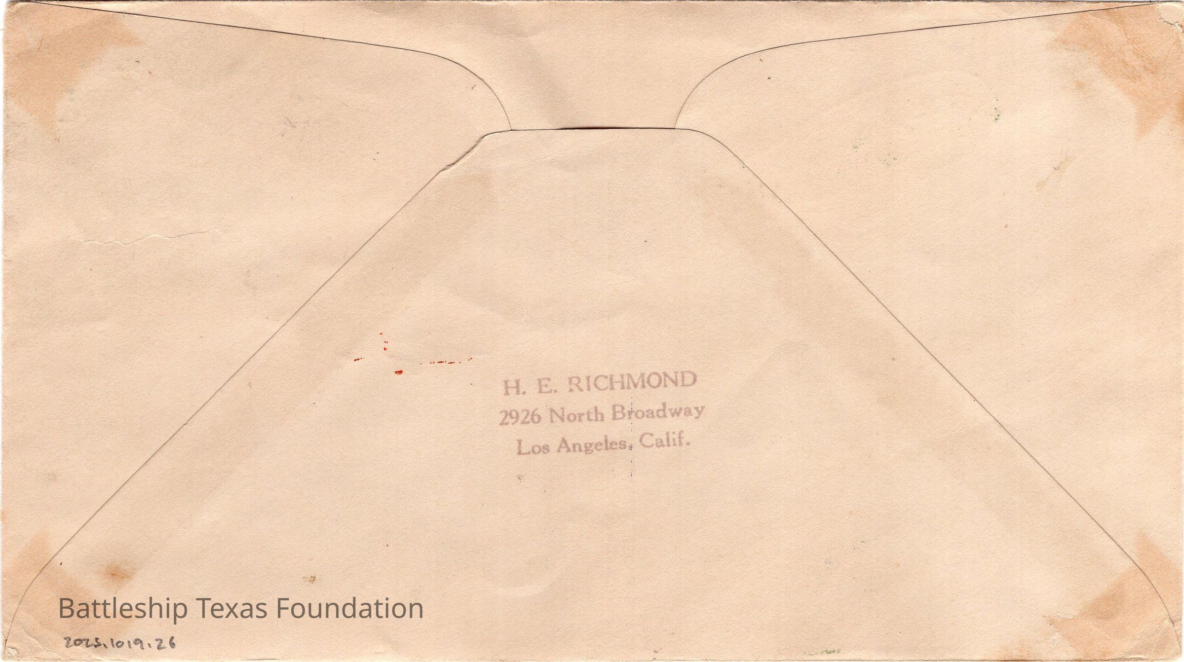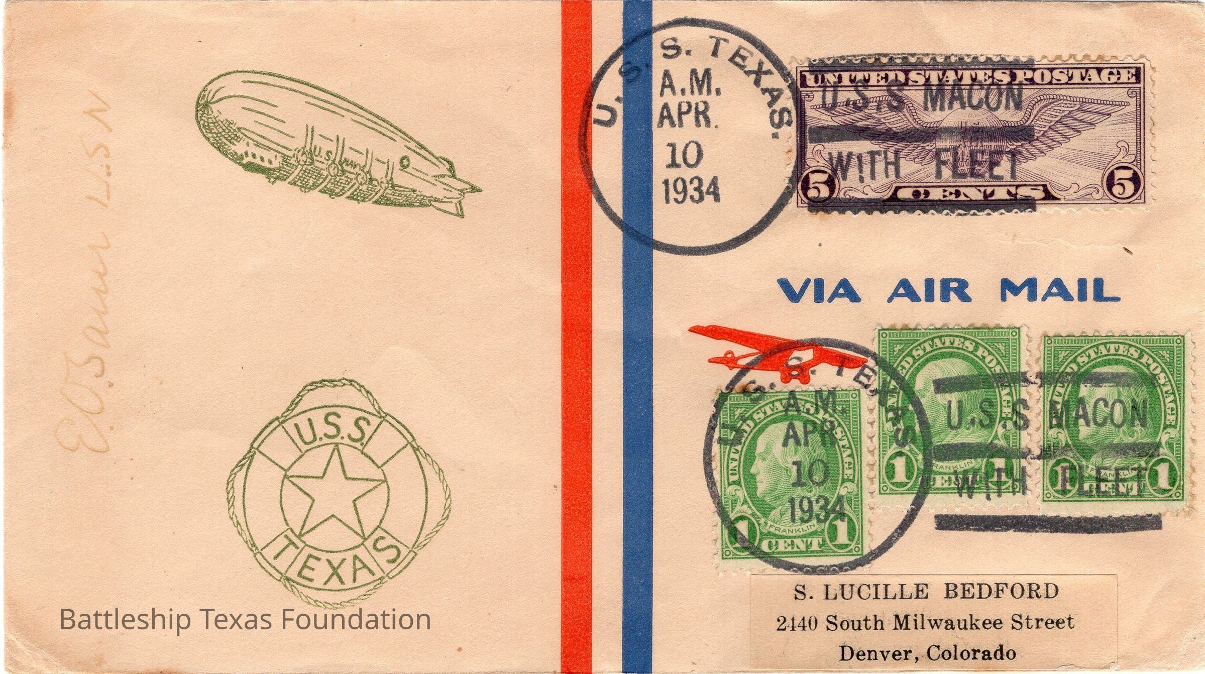 Addressed to S. Lucille Bedford from E.O. Tauer. Back of envelope has a stamp for H.E. Richmond. Envelope sent from USS Texas on the morning of April 10, 1934, while with the fleet. Features a stamp of a zeplin and life preserver with "U.S.S. TEXAS" around the circumference. Stamped as sent "VIA AIR MAIL" and sent to USS Macon for final postage.Context