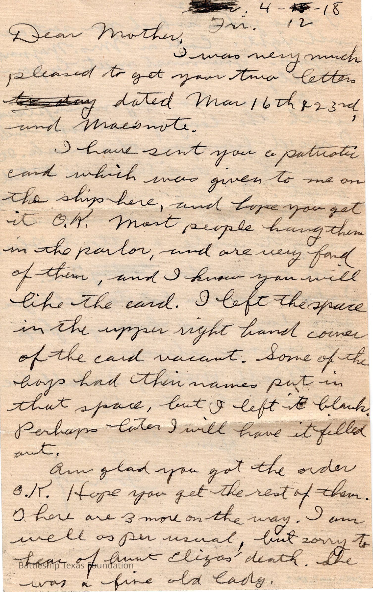 Letter dated to 4-12-18 and addressed to Mother. Original date scratched out.Context