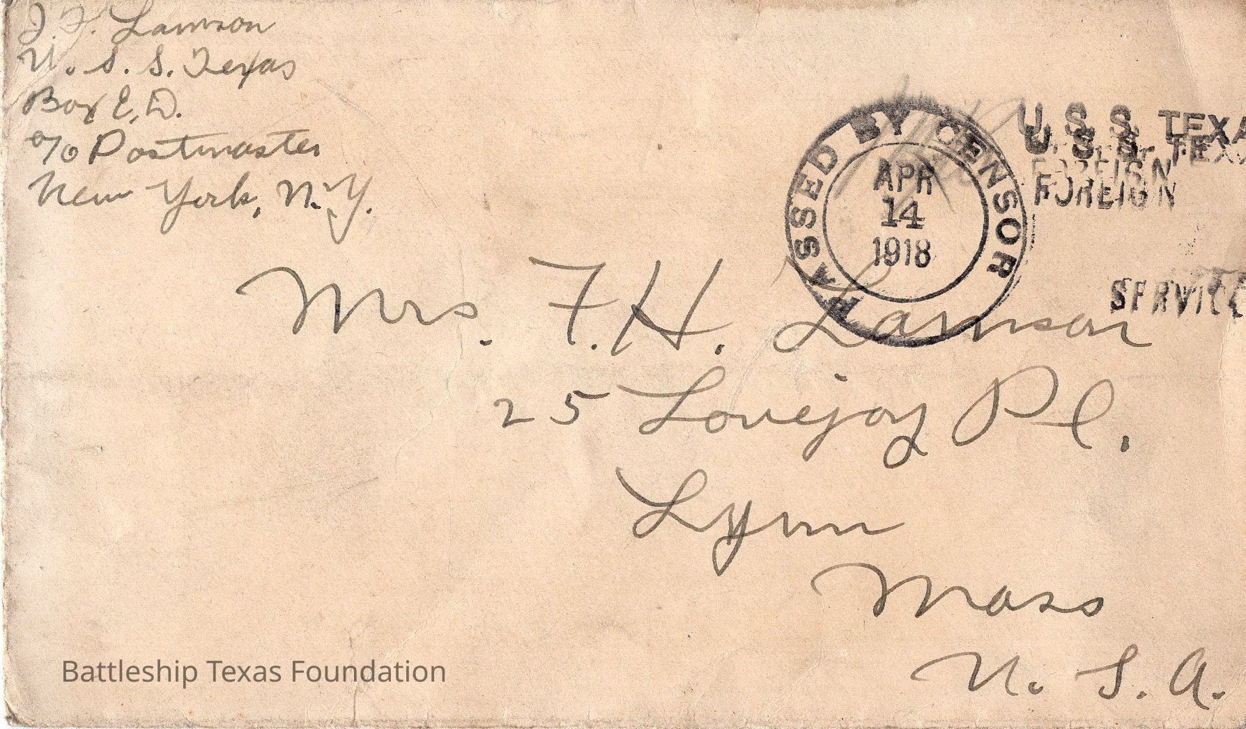 envelope stamped "PASSED BY CENSOR APR 14 1918" and "U.S.S. TEXAS FOREIGN SERVICE"Context