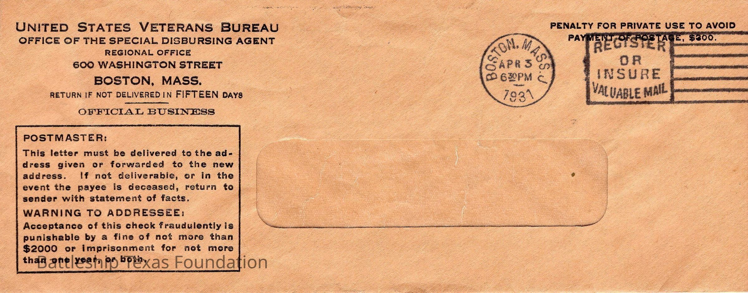 Envelope sent on April 3, 1931 by the United States Veterans Bureau.Context