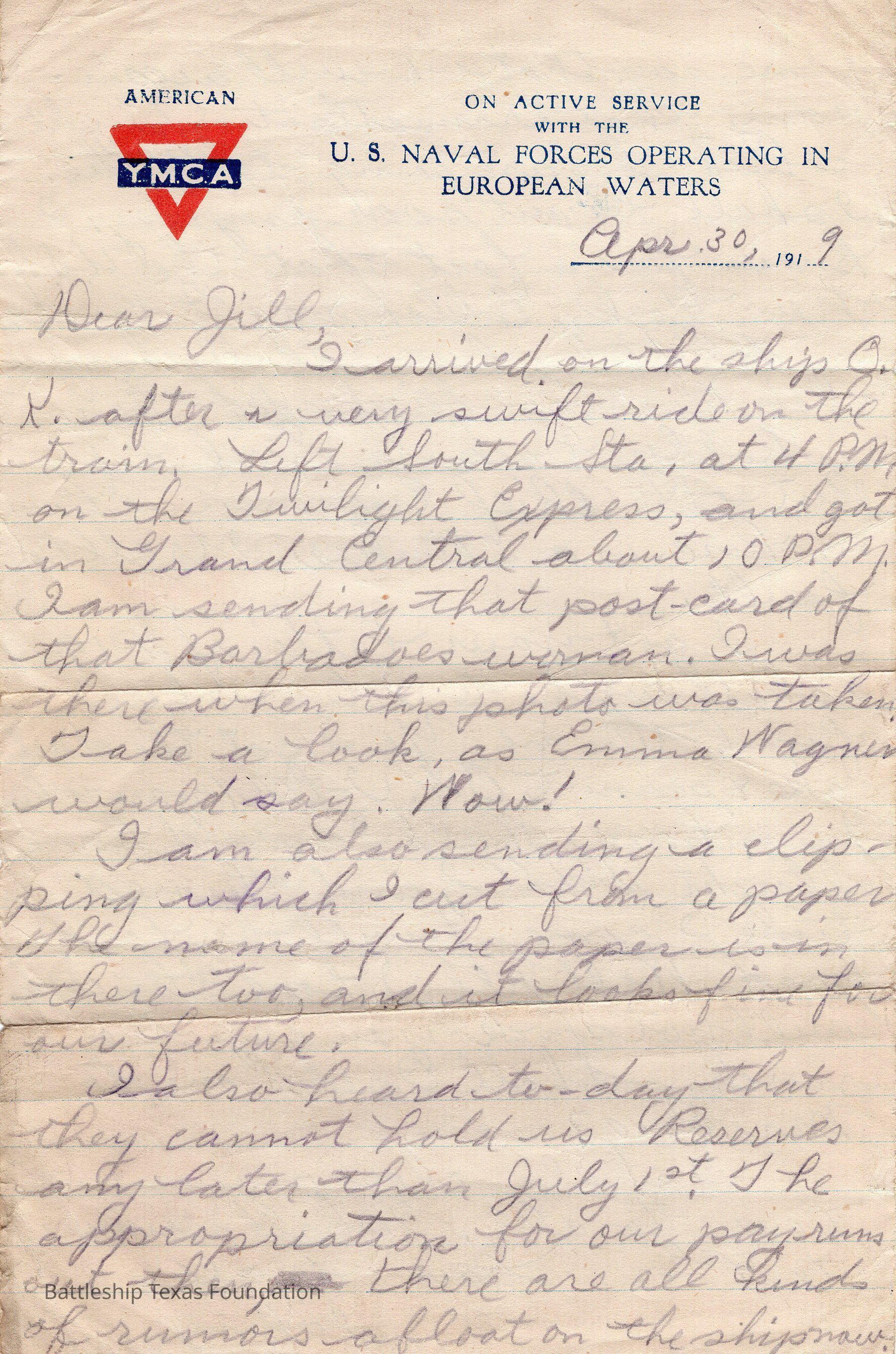 Letter written on YMCA letterhead on April 30, 1919 and addressed to Jill.