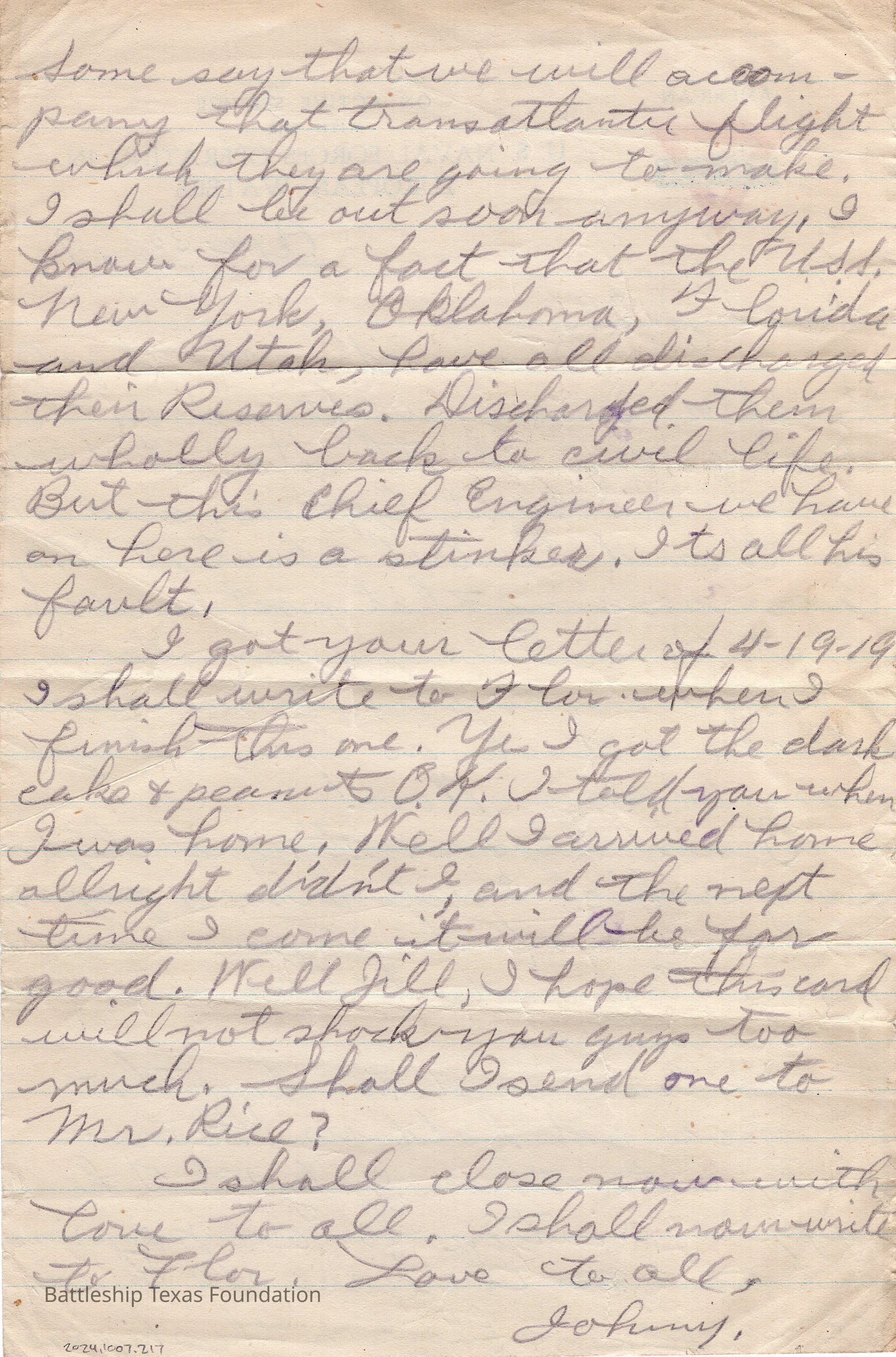 John Lamson was a MM1c on Battleship Texas from May 1917 to June 1919. Throughout his time on Texas, he sent a letter to his family at least once a week, often more. Longer stretches of absence are explained either by movement across the Atlantic, or with the Grand Fleet.