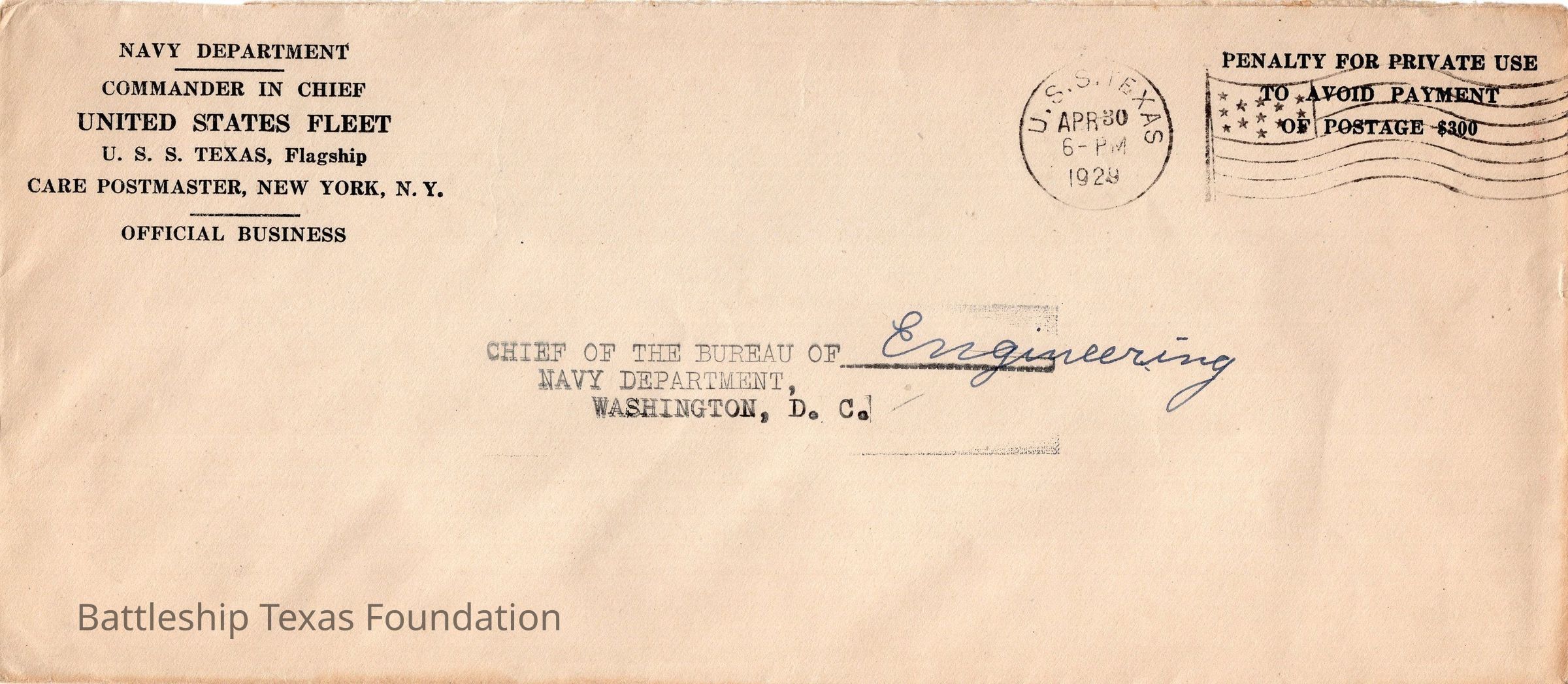 Addressed to Chief of the Bureau of Engineering, Navy Department form the Commander in Chief United States Fleet. Envelope sent from USS Texas on the afternoon of April 30, 1929.Context