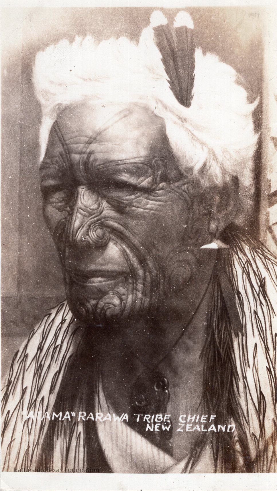 Elder woman with white hair and facial tattoos poses looking to the left. Captioned "ATAMA' RARAWA TRIBE CHIEF"Context
