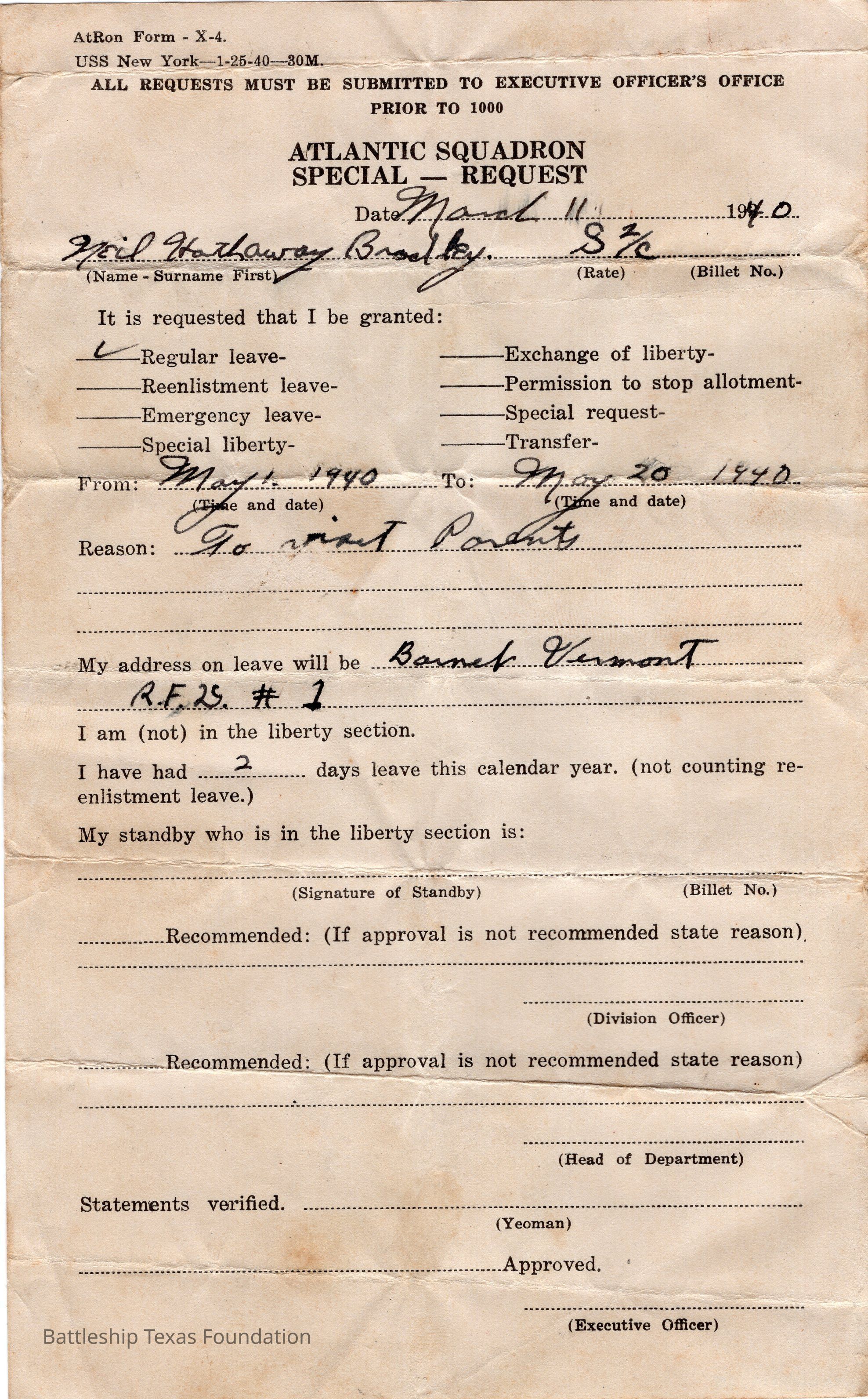Form for USS New York filled out by Neil Hathaway Bradley on March 11, 1940. He requested leave from May 1 through May 20, 1940, to see his parents in Vermont.Context