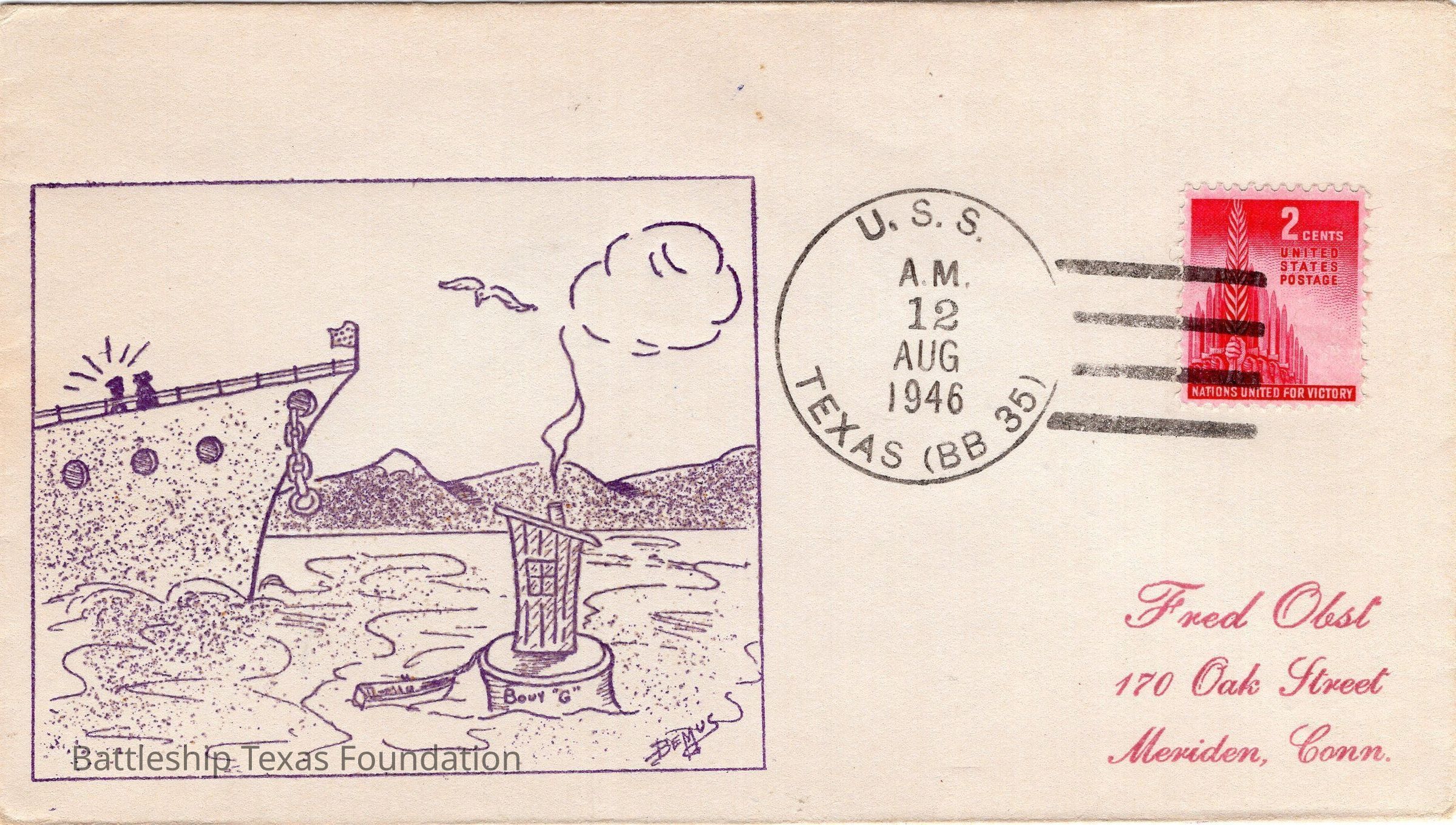 Addressed to Fred Obst. Envelope sent from USS Texas on the morning of August 12, 1946. Features a stamp of the bow of a ship approaching a bouy, with a shoreline in the background.
