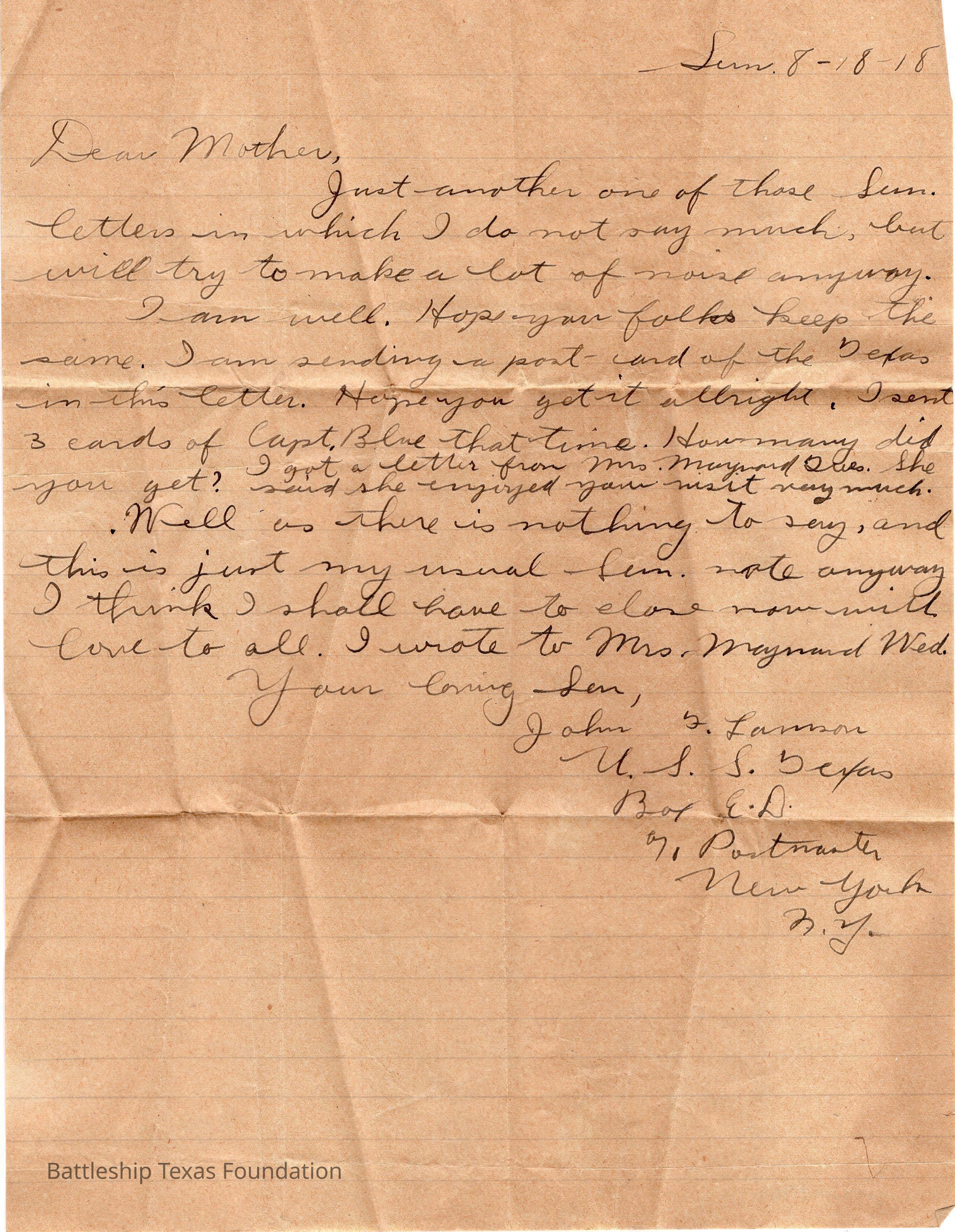 John Lamson was a MM1c on Battleship Texas from May 1917 to June 1919. Throughout his time on Texas, he sent a letter to his family at least once a week, often more. Longer stretches of absence are explained either by movement across the Atlantic, or with the Grand Fleet.