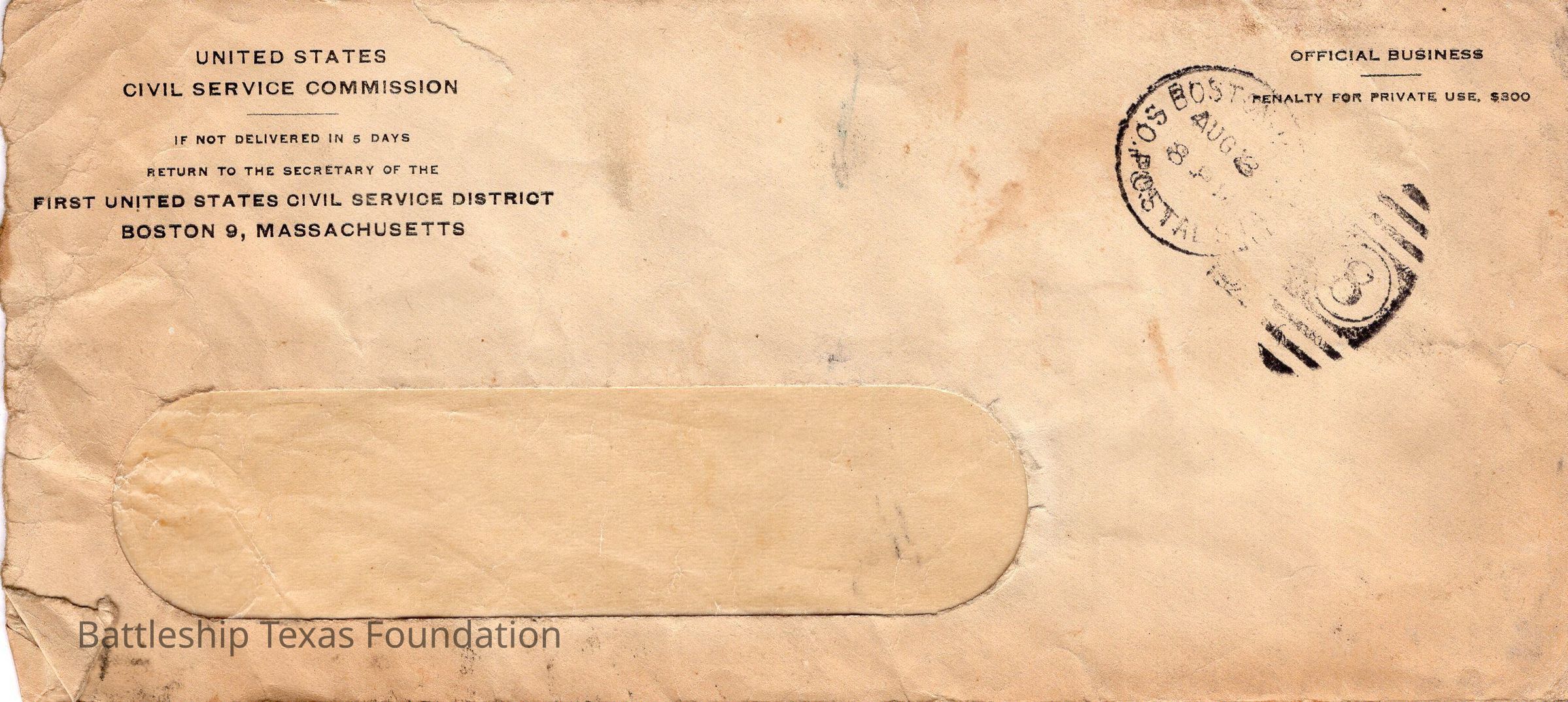 Envelope sent by United States Civil Service Commission to John Lamson. Date smudged and obscured.Context
