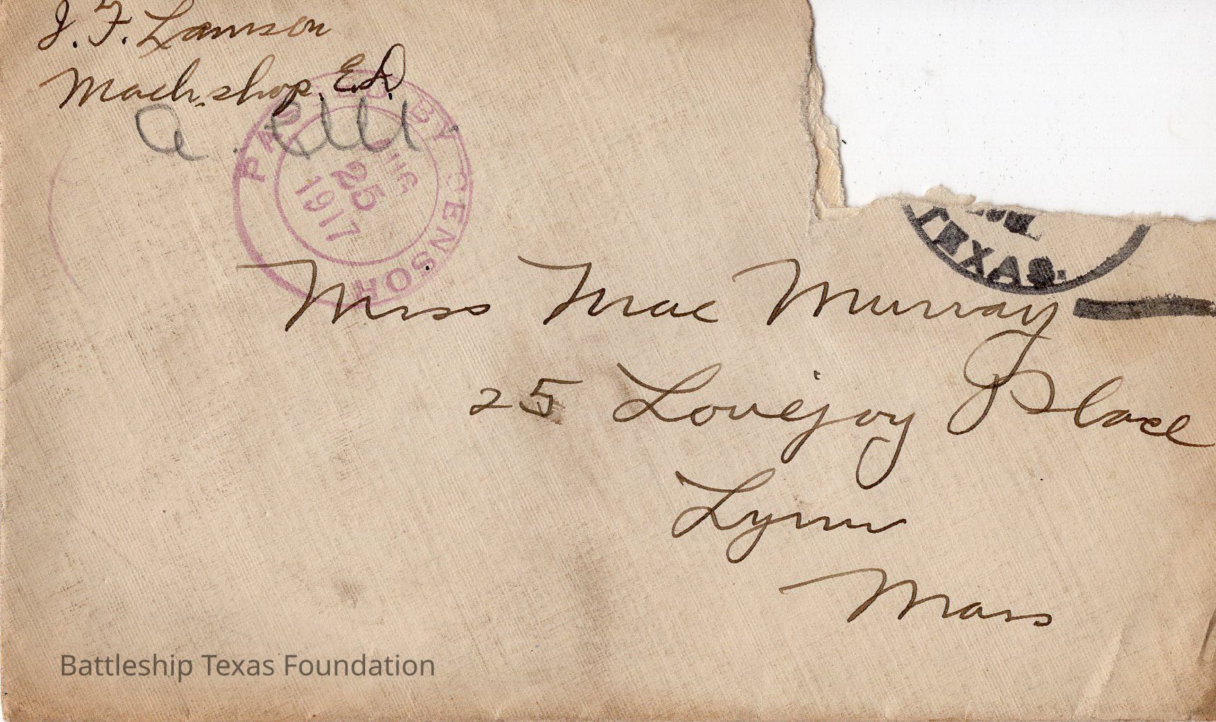 envelope "PASSED BY CENSOR AUG 25 1917" addressed to Miss Mae. "TEXAS" portion of stamp visible underneath large torn section.Context