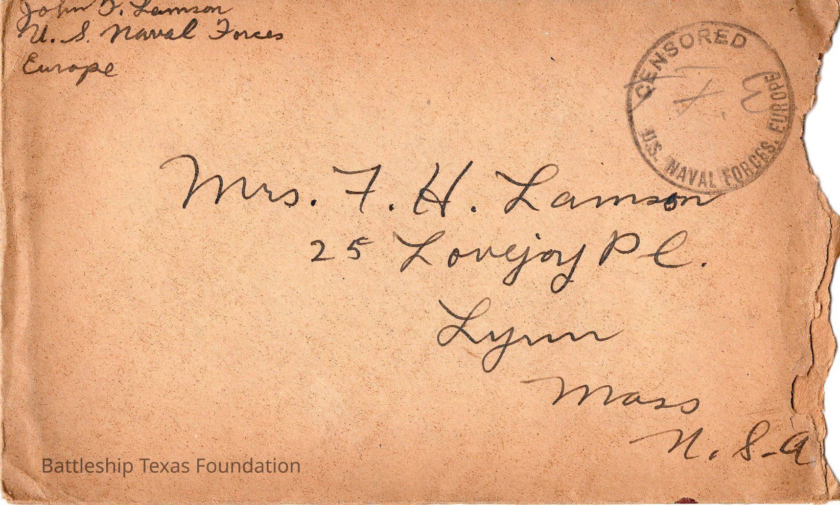 Envelope stamped "CENSORED U.S. NAVAL FORCES. EUROPE" with right side torn offContext