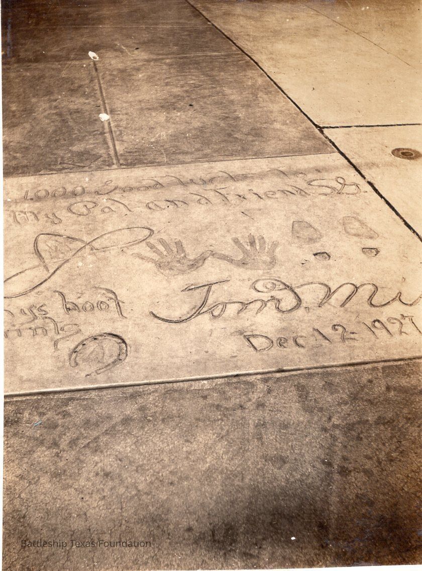 Features slab of cement with signatures, handprints, boot prints, and hoof prints with the date on the bottom right of the slab.Context