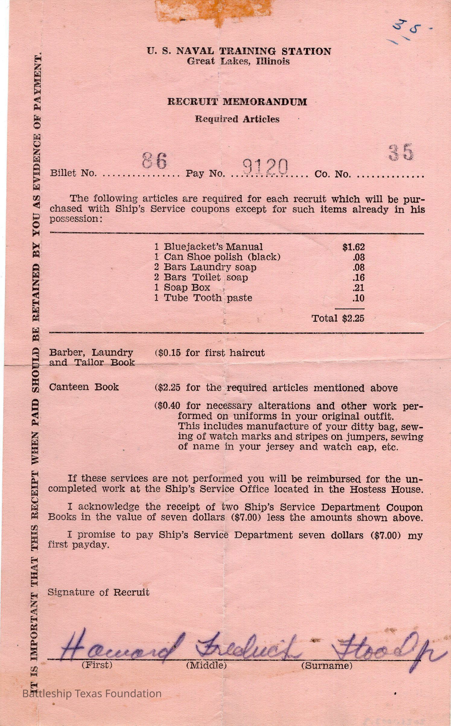 U.S. Naval Training Station from Great Lakes, Illinois detailing the required items recruits must bring. On pink paper. Signed at the bottom of the slip by Flood.Context