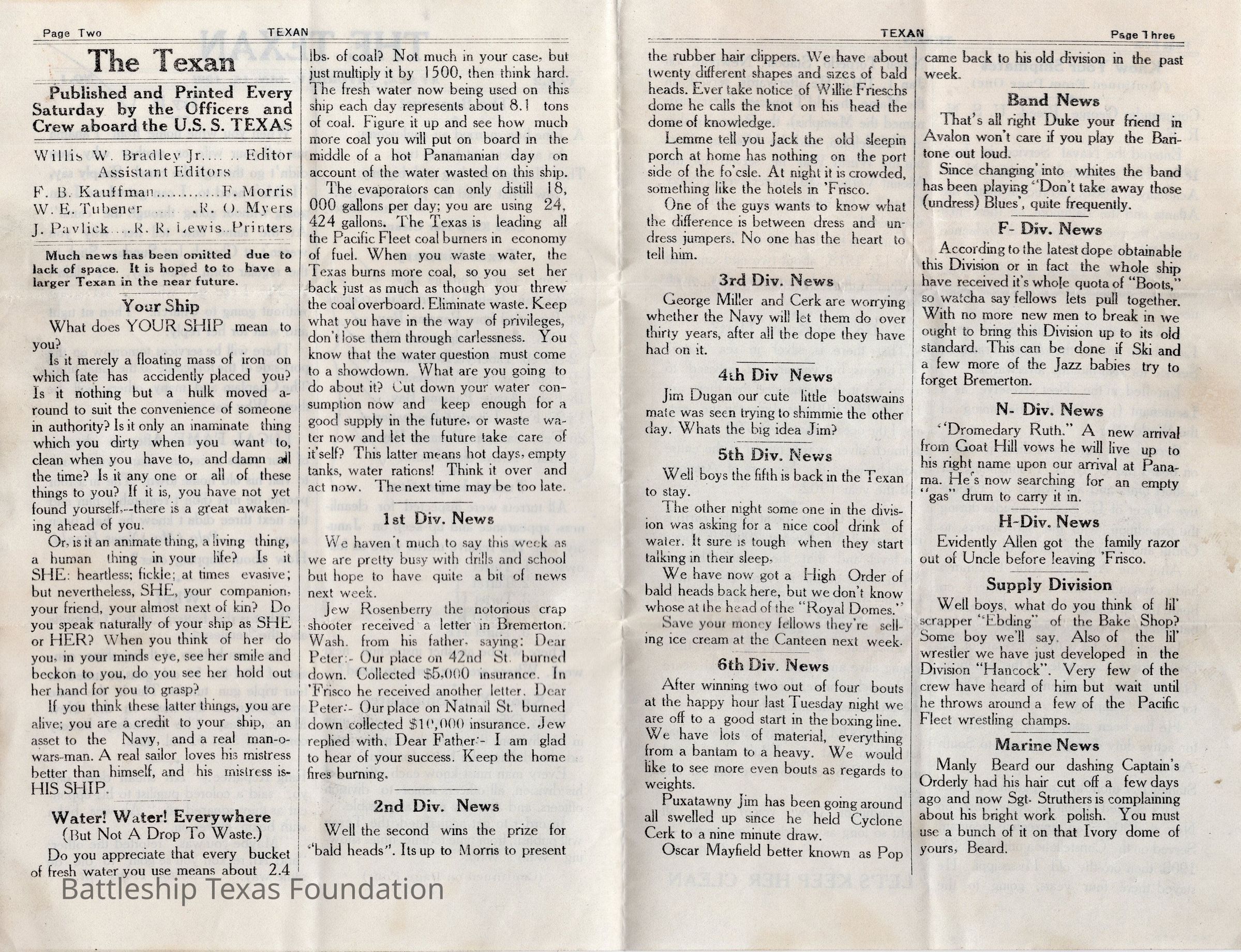 “The Texan” was a weekly newspaper, started in 1920, and published by the crew of Battleship Texas. The paper was published until 1923, running a total of four volumes, with special issues into 1924.Collection