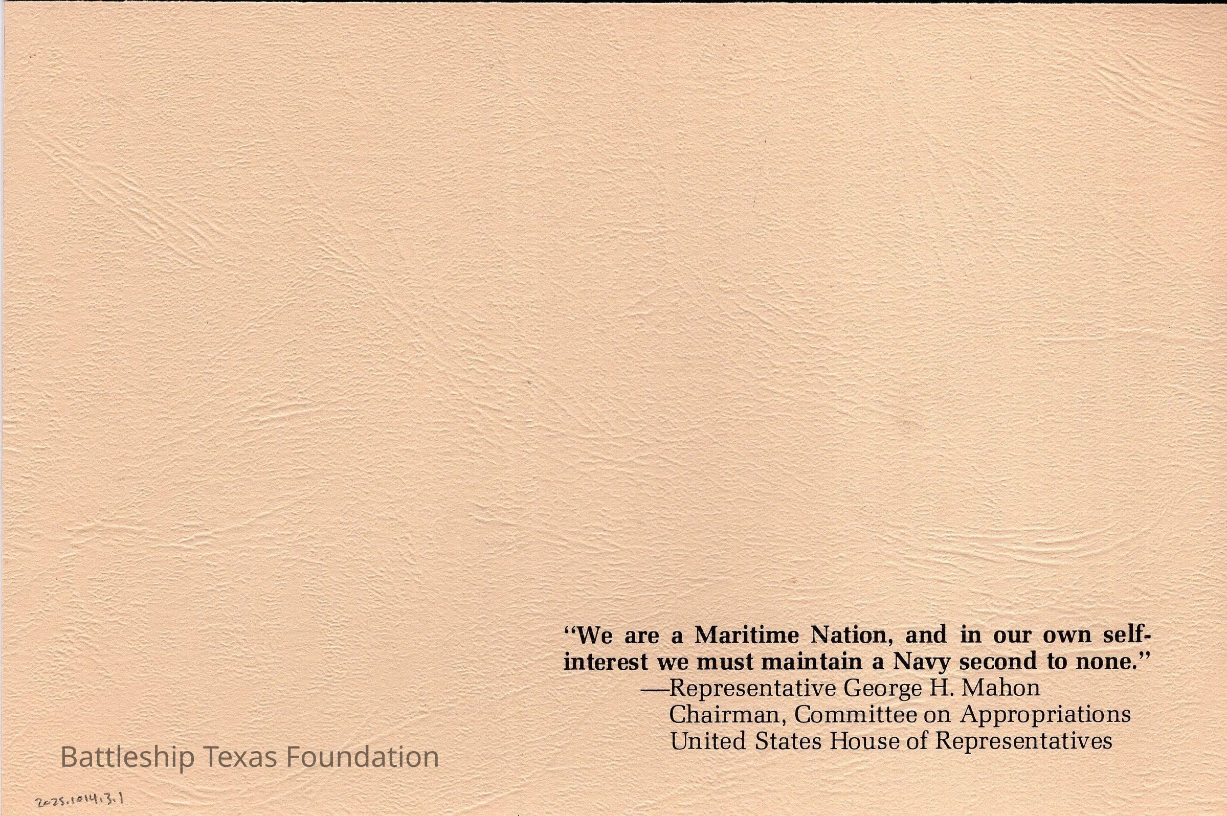 Booklet handed out at the launch of Cruiser Texas on August 9, 1975. Title is "Texas" spelled out in rope.Context