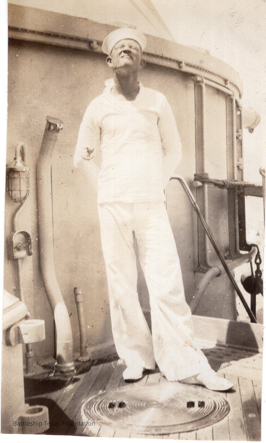 From a donated collection of individual photographs and pages out of a Texas crewmember's photo album. Items donated by the Los Angeles Maritime Museum.