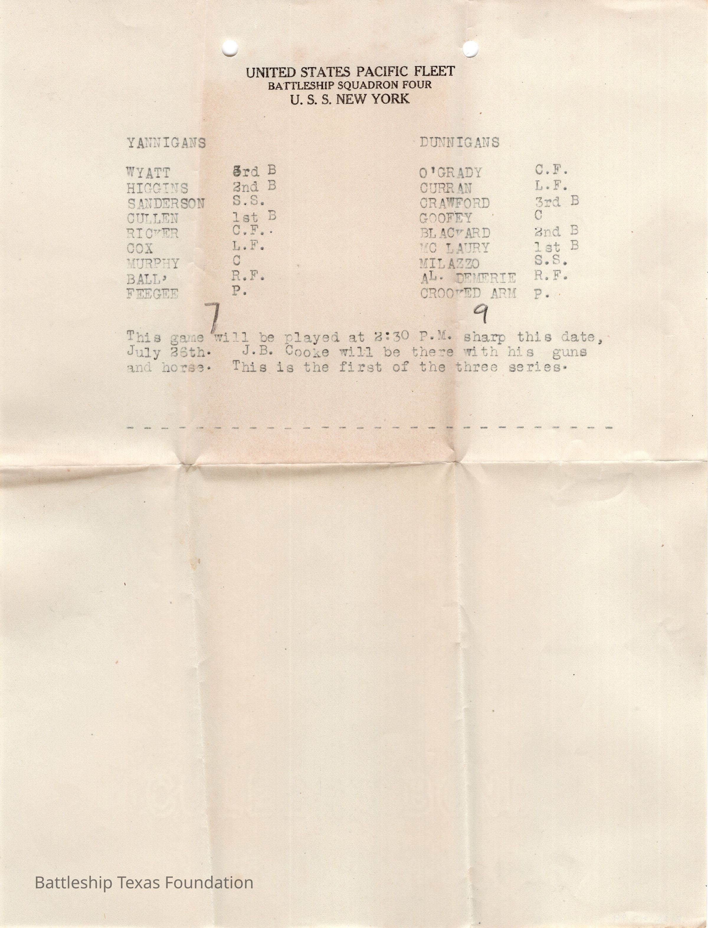 List of two baseball teams for the United States Fleet: Battleship Squadron Four. Cox is a member of the "Yannigans" against the "Dunnigans," to take place on July 26 in an unknown year.Context