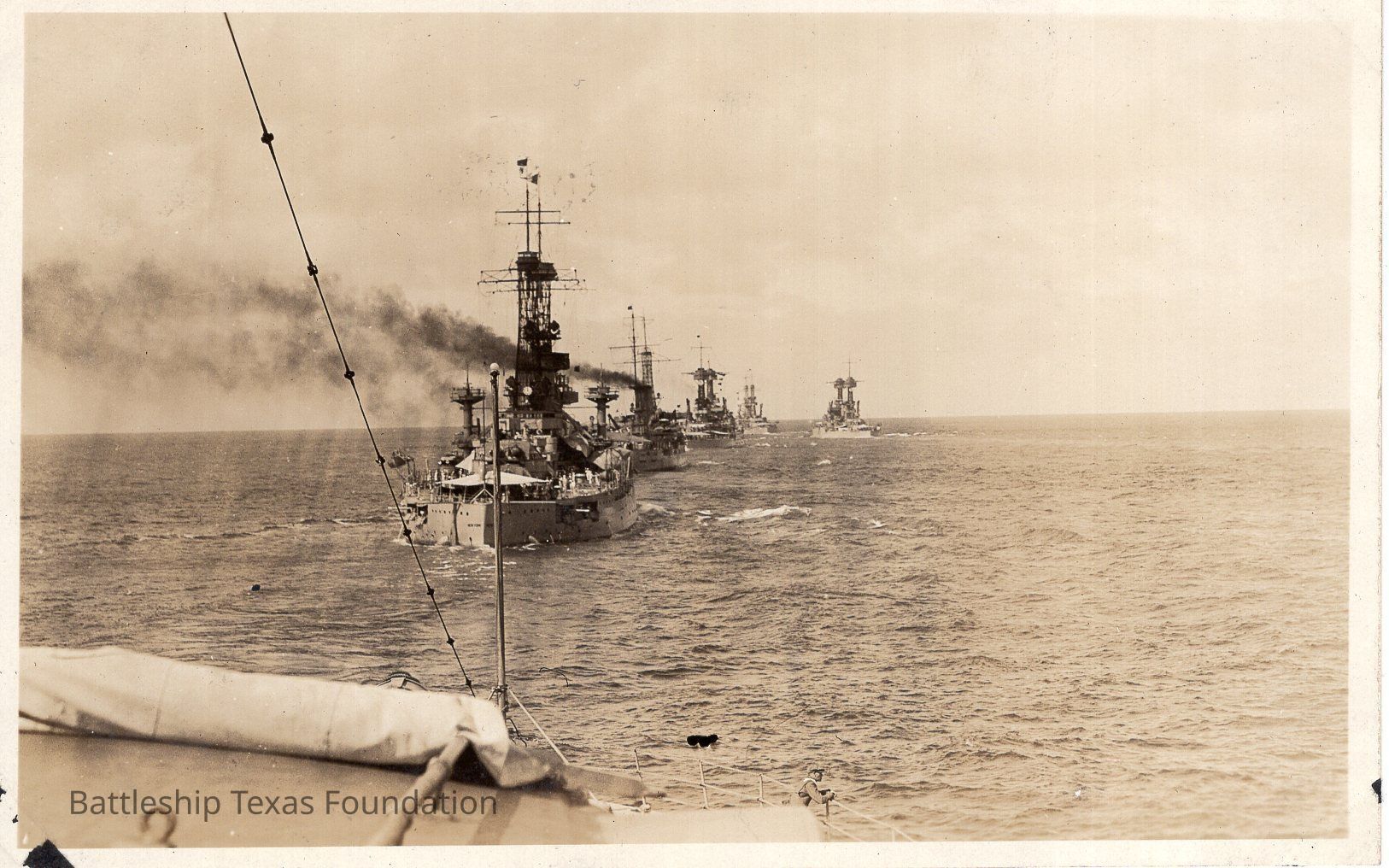 Features a line of five battleships not including the one the camera is set up on. USS New York is the closest ship to camera in the lineup.Context