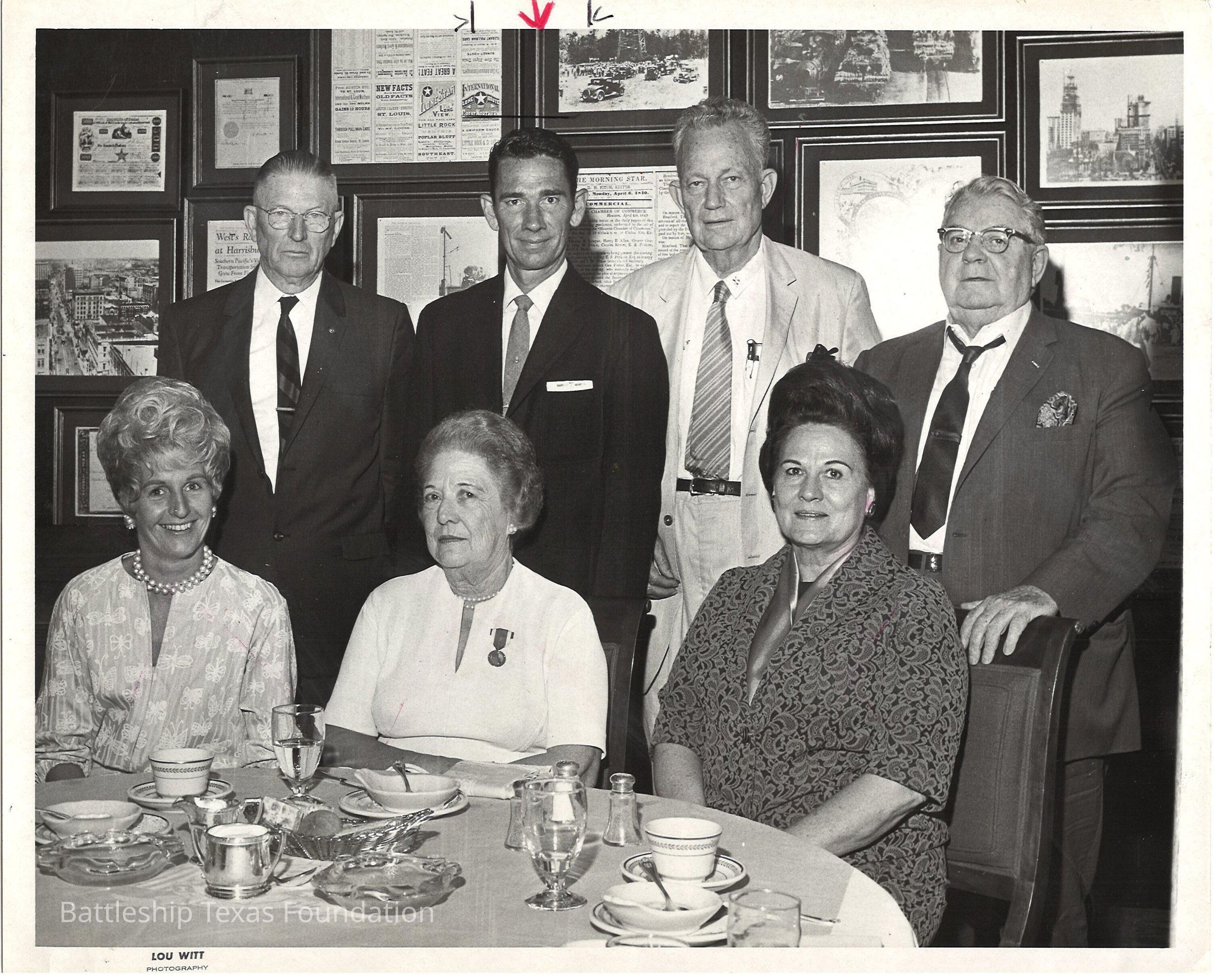 Photo of Ship Superintendent Harry B. Thomas (2nd from left, back row, with red arrow) and the commissioners of the Battleship Texas Commission in a resturaunt. Three women commissioners are seated and the three male commissioners and Thomas are standing behind them. Lloyd Gregory, chairman, is 2nd from the rght back row.