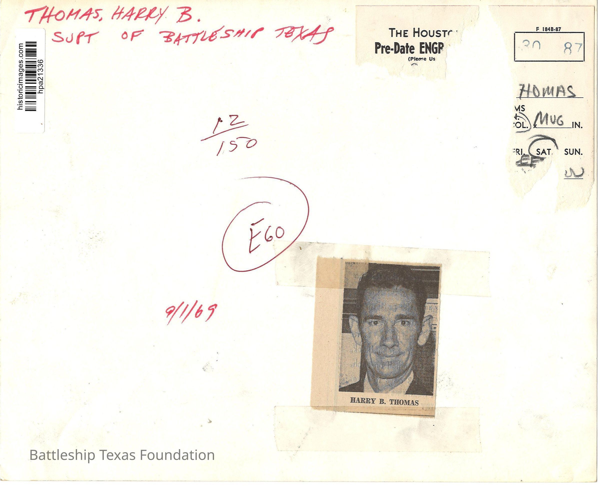 On the back of the image is handwritten "Thomas, Harry B. / Supt. of Battleship Texas" and "9/1/69." Taped to the back is a newspaper headshot of Harry B. Thomas.Context