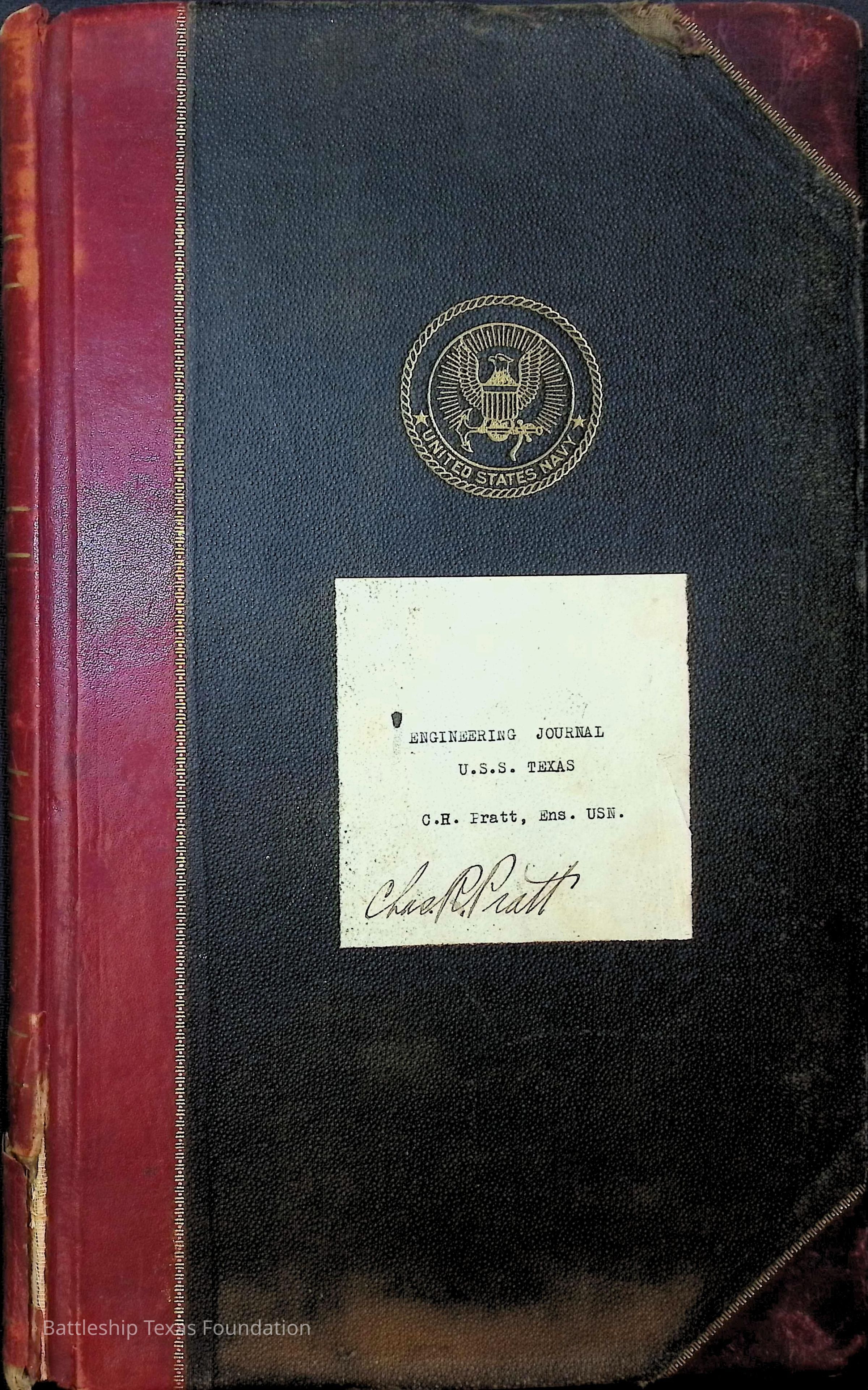 Black logbook with red spine owned by Charles Pratt and issued to him in 1921 while he was a crewmember of Battleship Texas. Pratt kept active notes throughout 1921 and later used the book elsewhere for separate purposes outside military application.