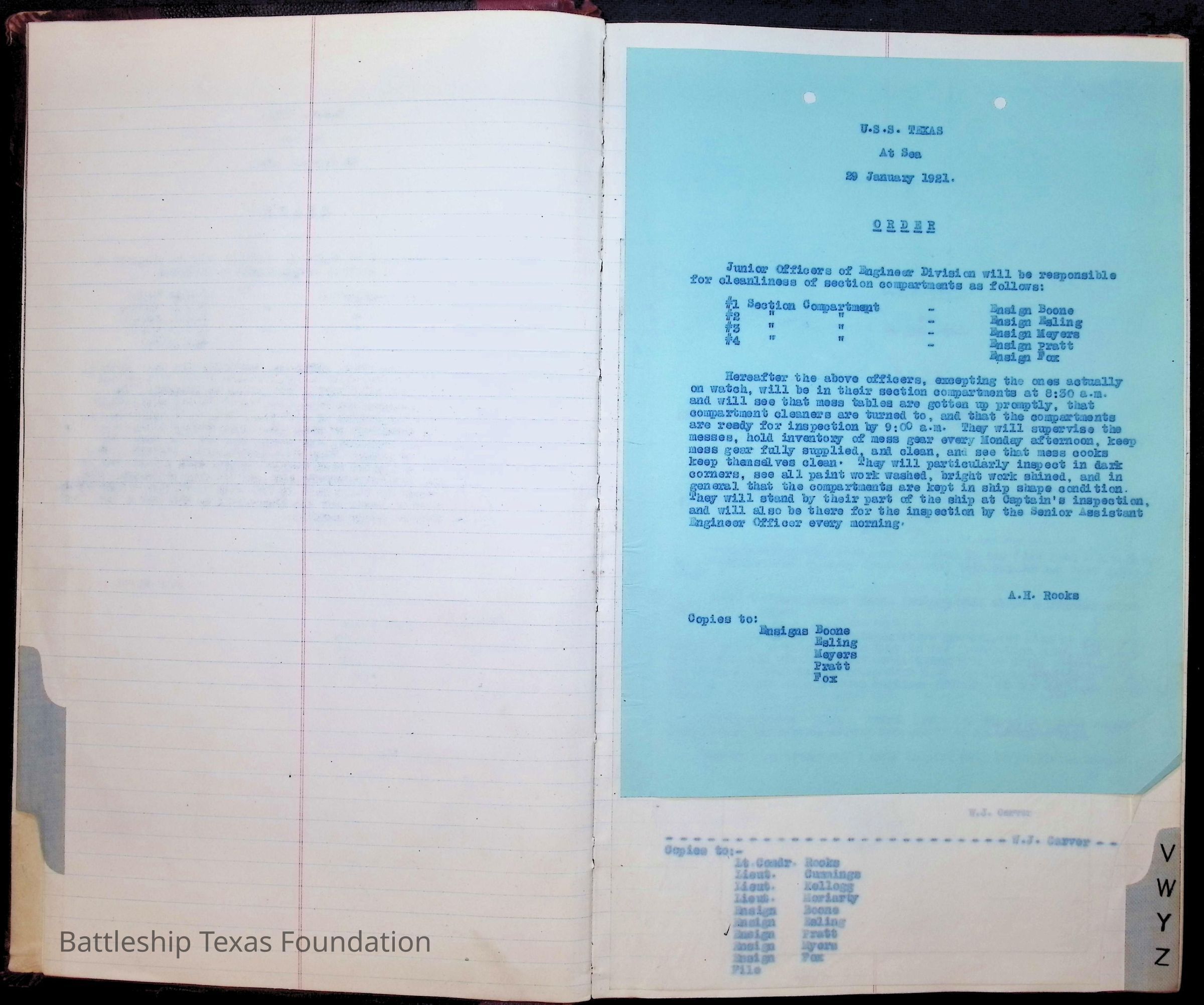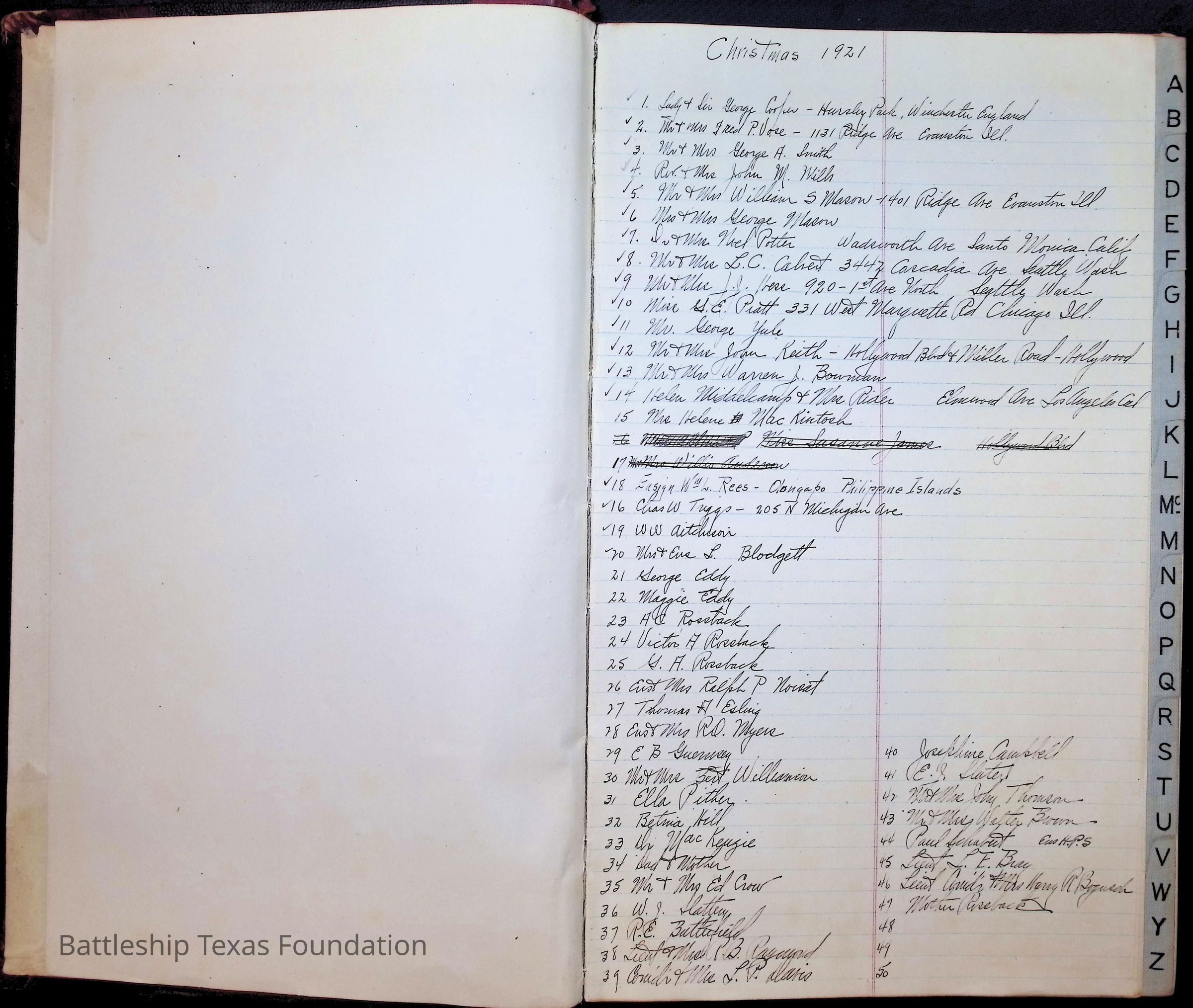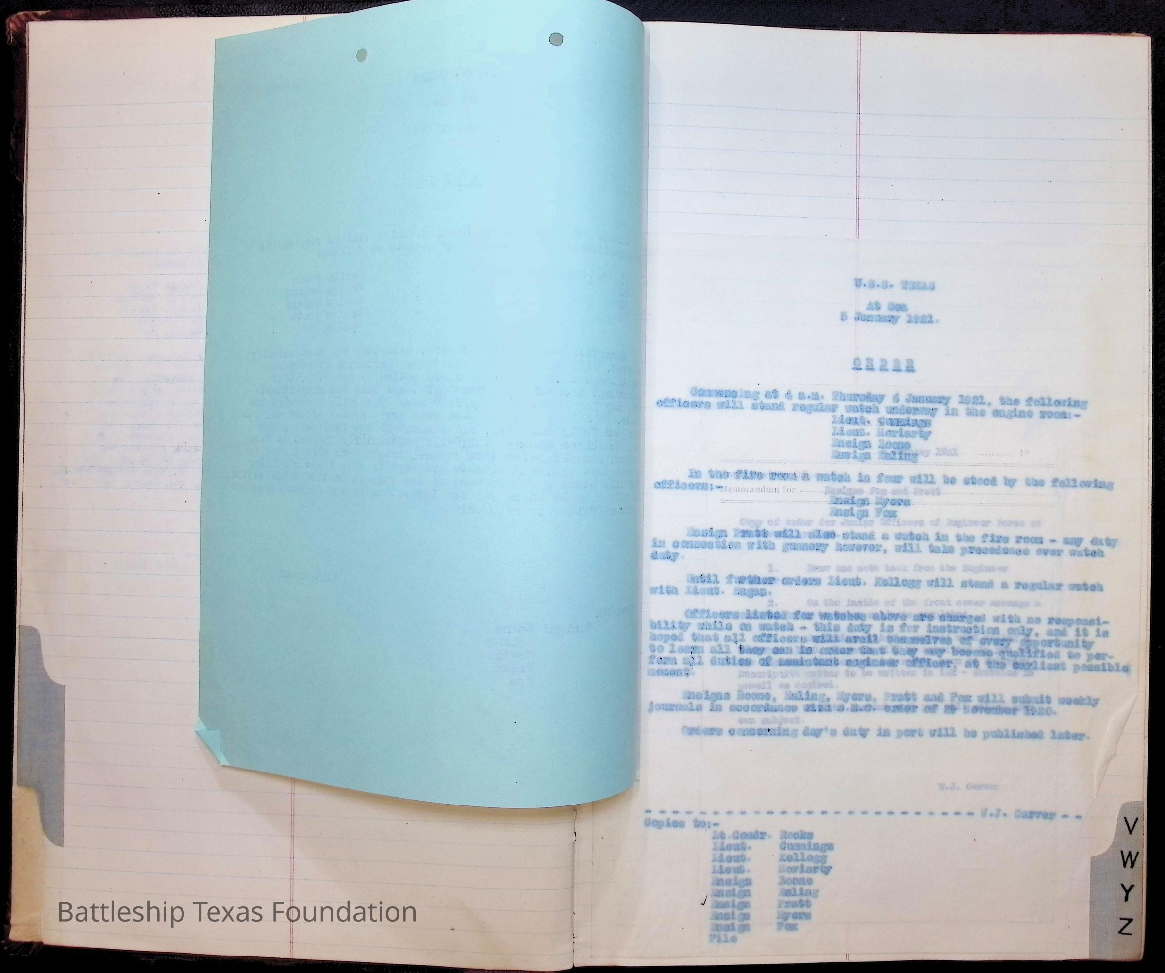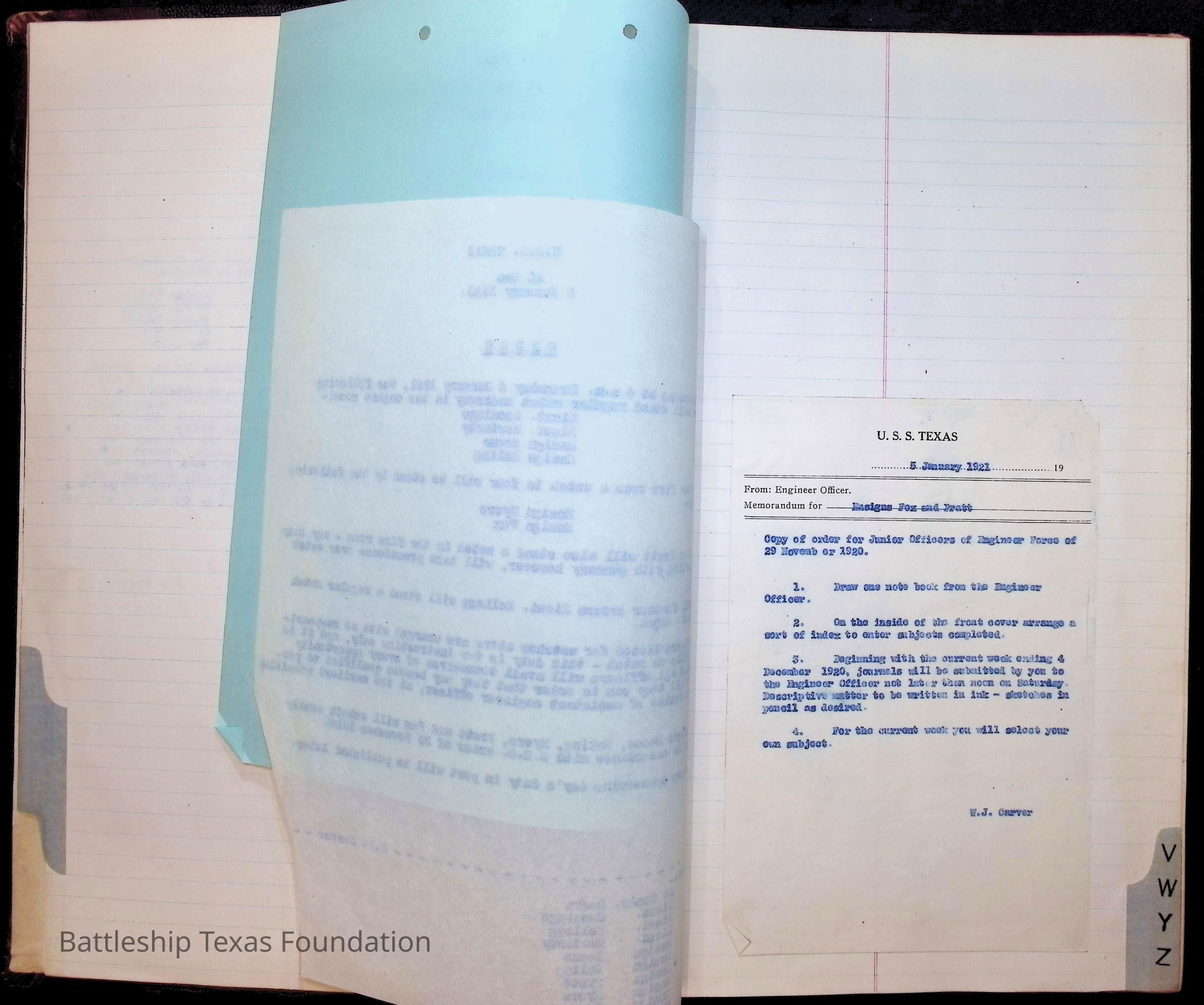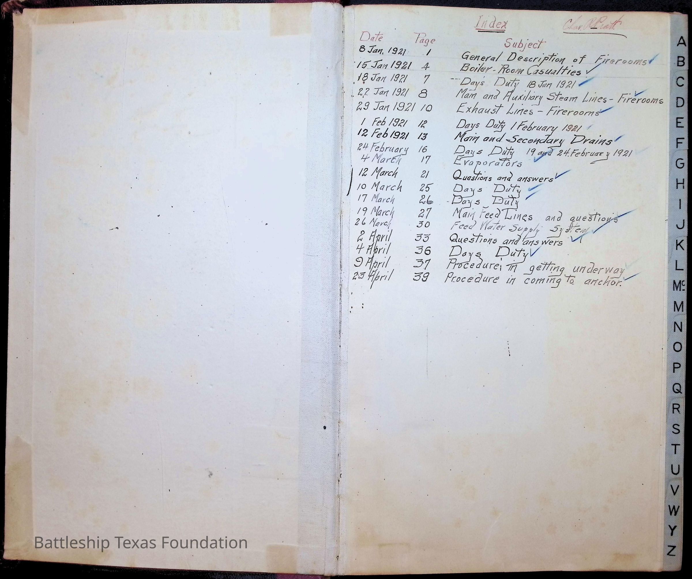 Book begins with an alphabetical tabs on the edges of the pages. The only thing in that section are an index of time on Texas, notes on a Christmas celebration, and orders in January of 1921.