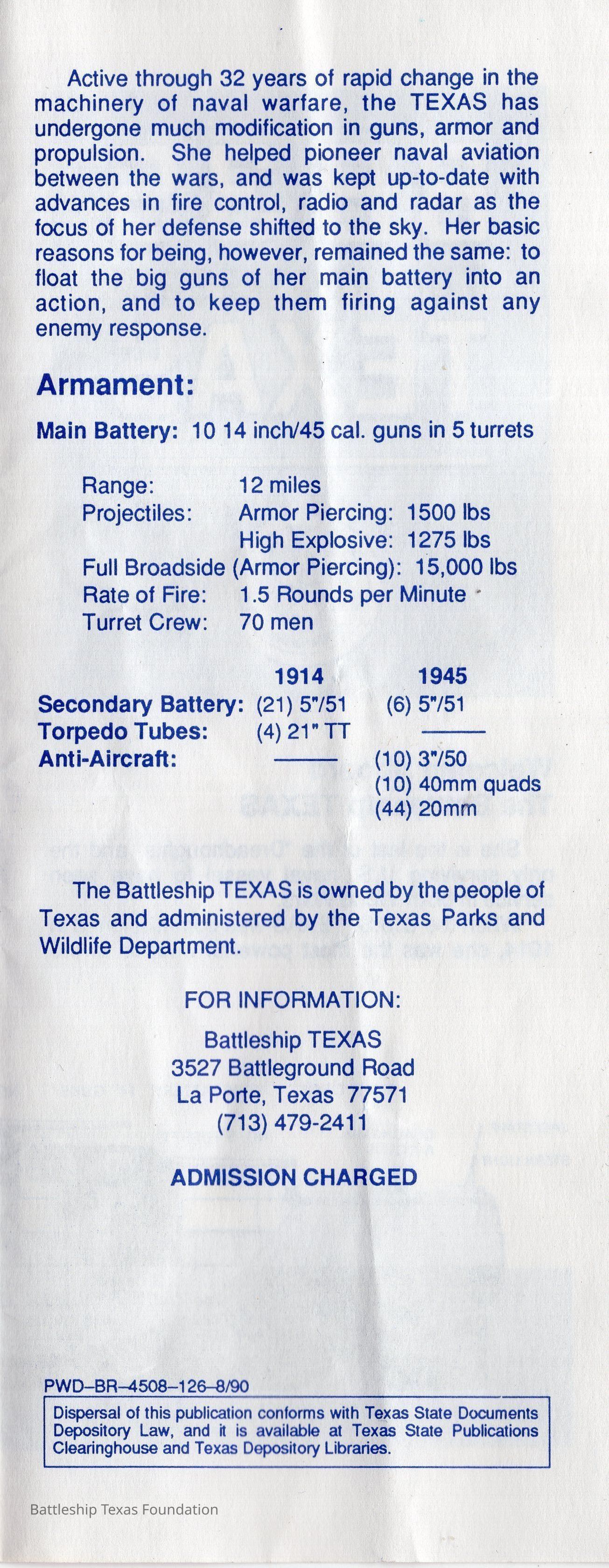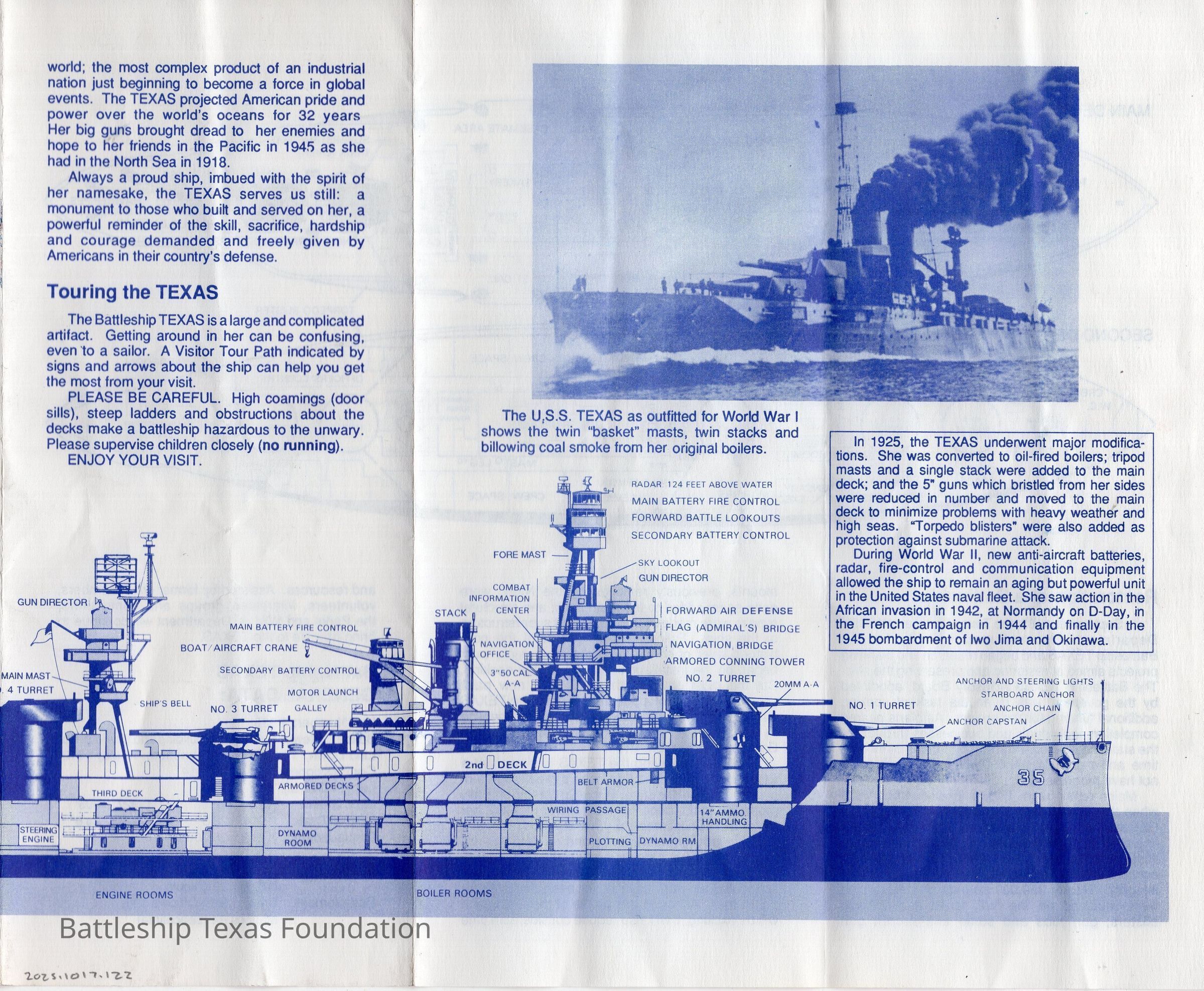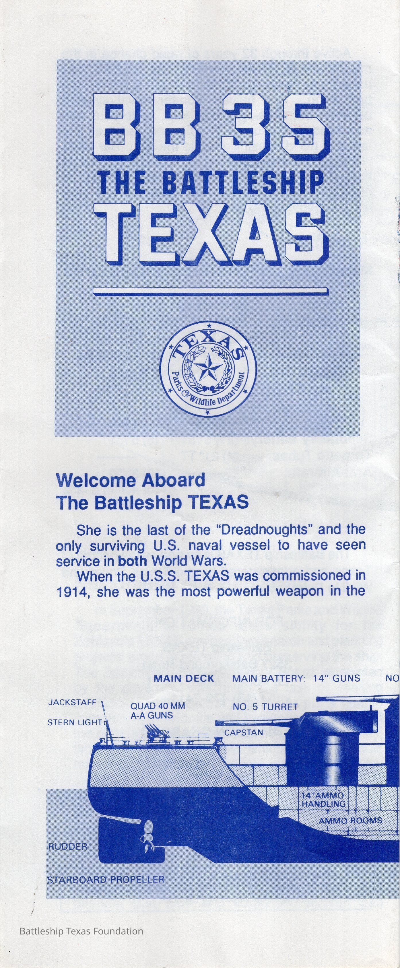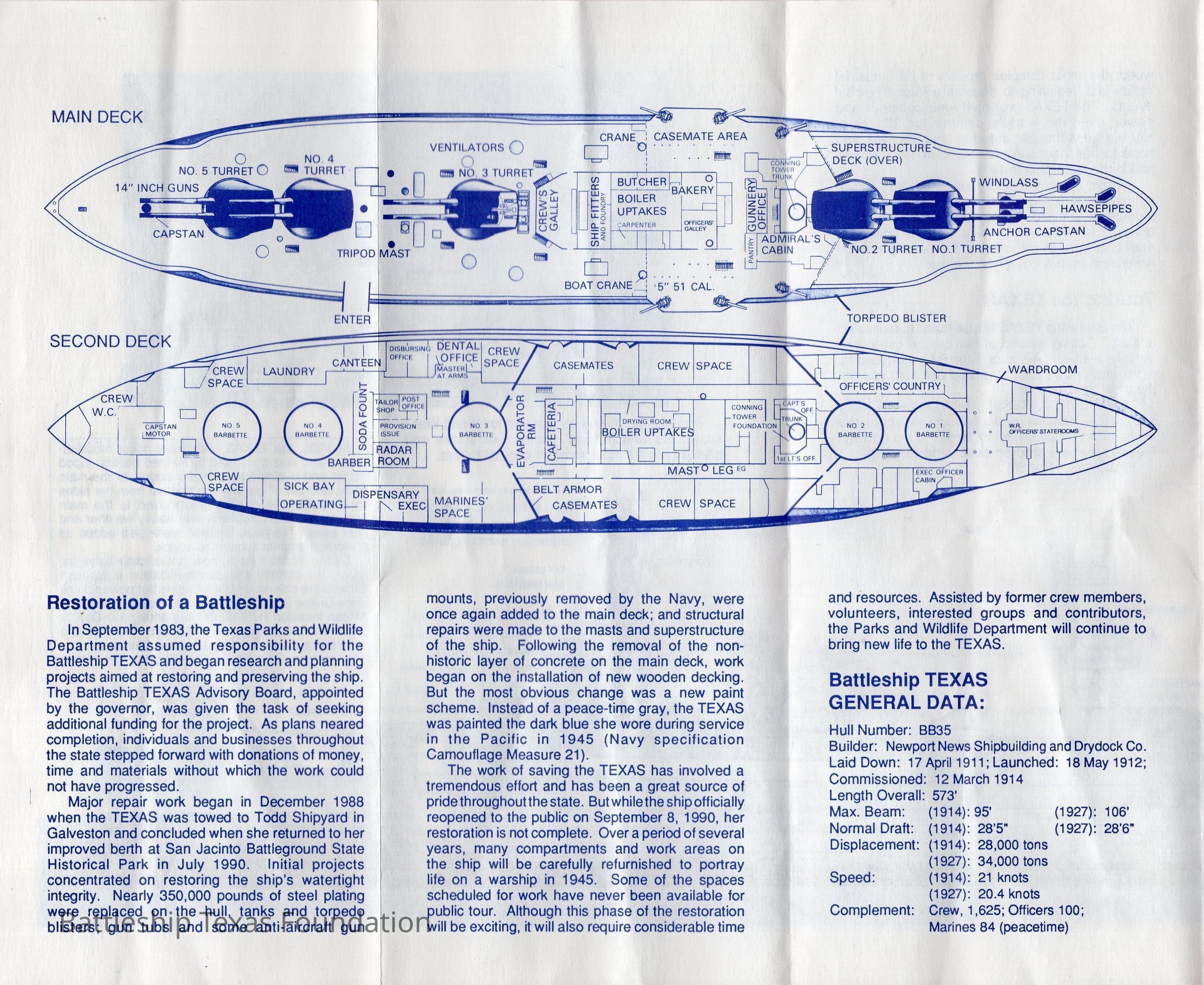 Fourfold museum pamphlet for Battleship Texas. Features partial inboard profile on front, and main and second deck layout on back.Context