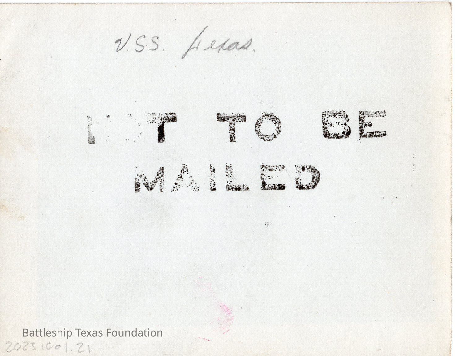 Texas in foreground with measure 22. Cargo ship in background to the left. Pier in bottom of photo. Back is stamped "NOT TO BE MAILED"Context
