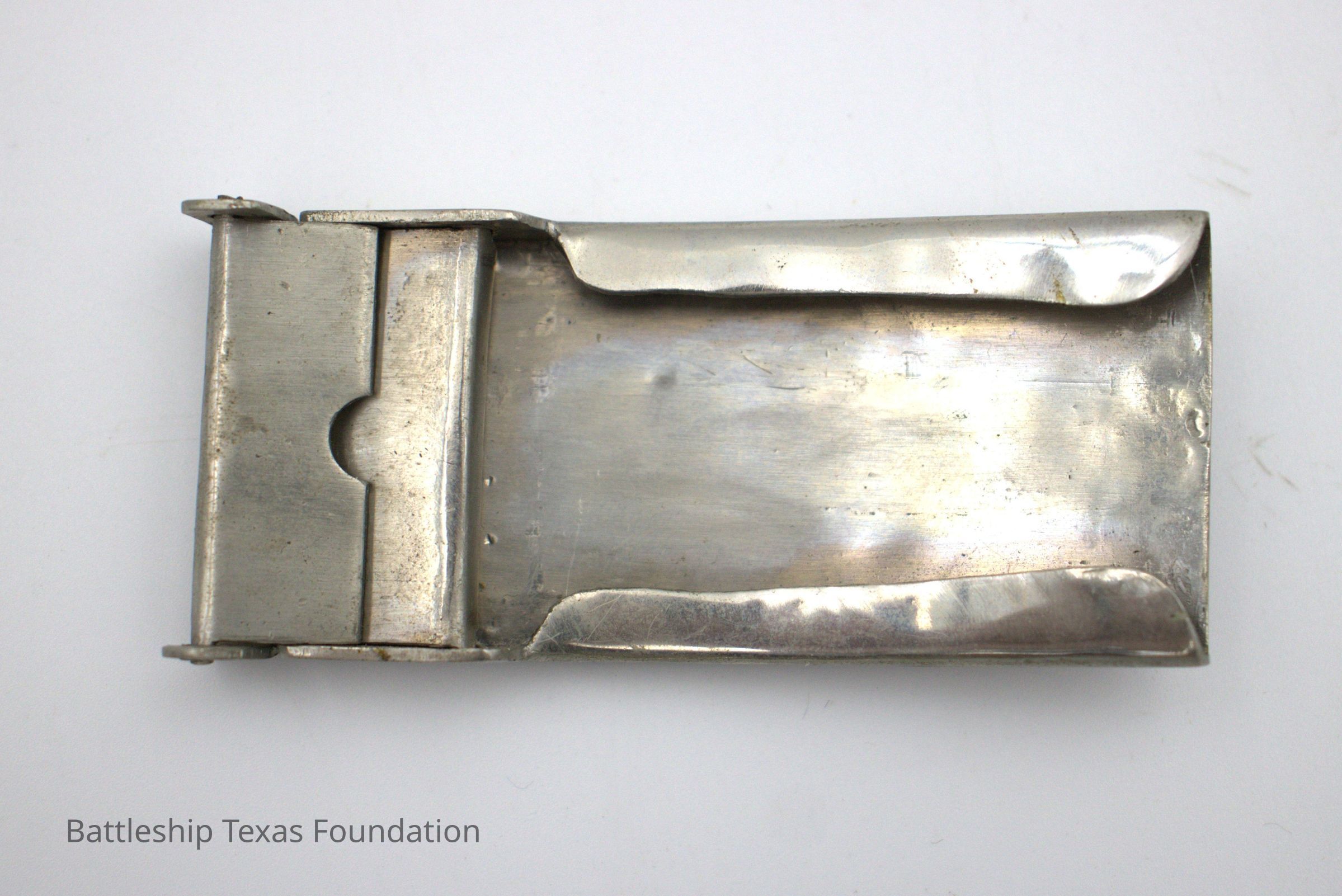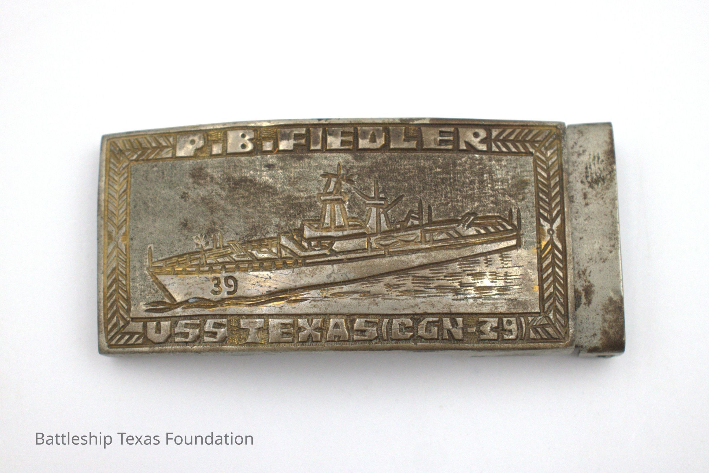Belt buckle with etching of Cruiser Texas and name "P.B.FIEDLER" and "USS TEXAS(CGN-39).Context