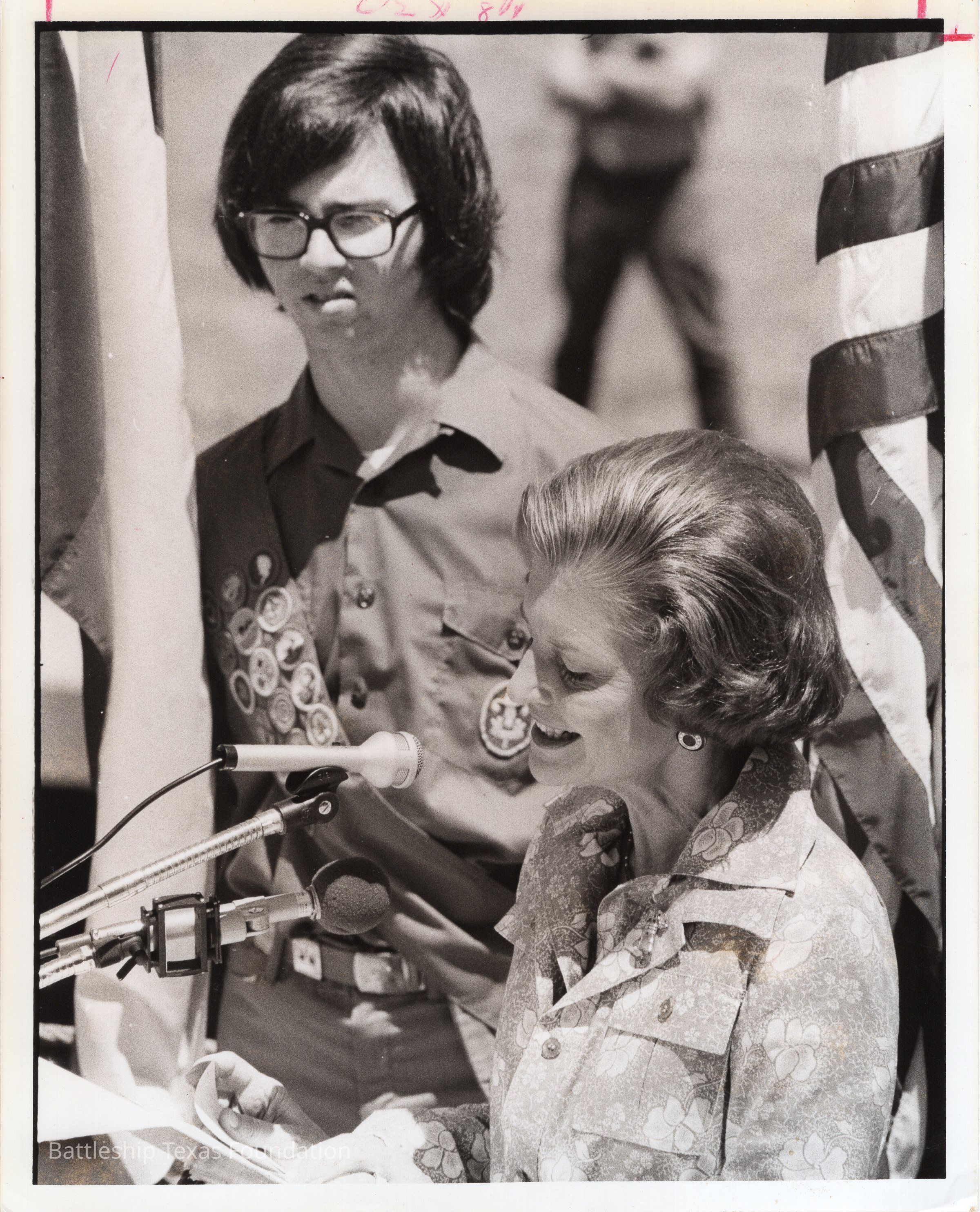 Betty Ford speaking with Scout in background. Flag on right of photo.Context