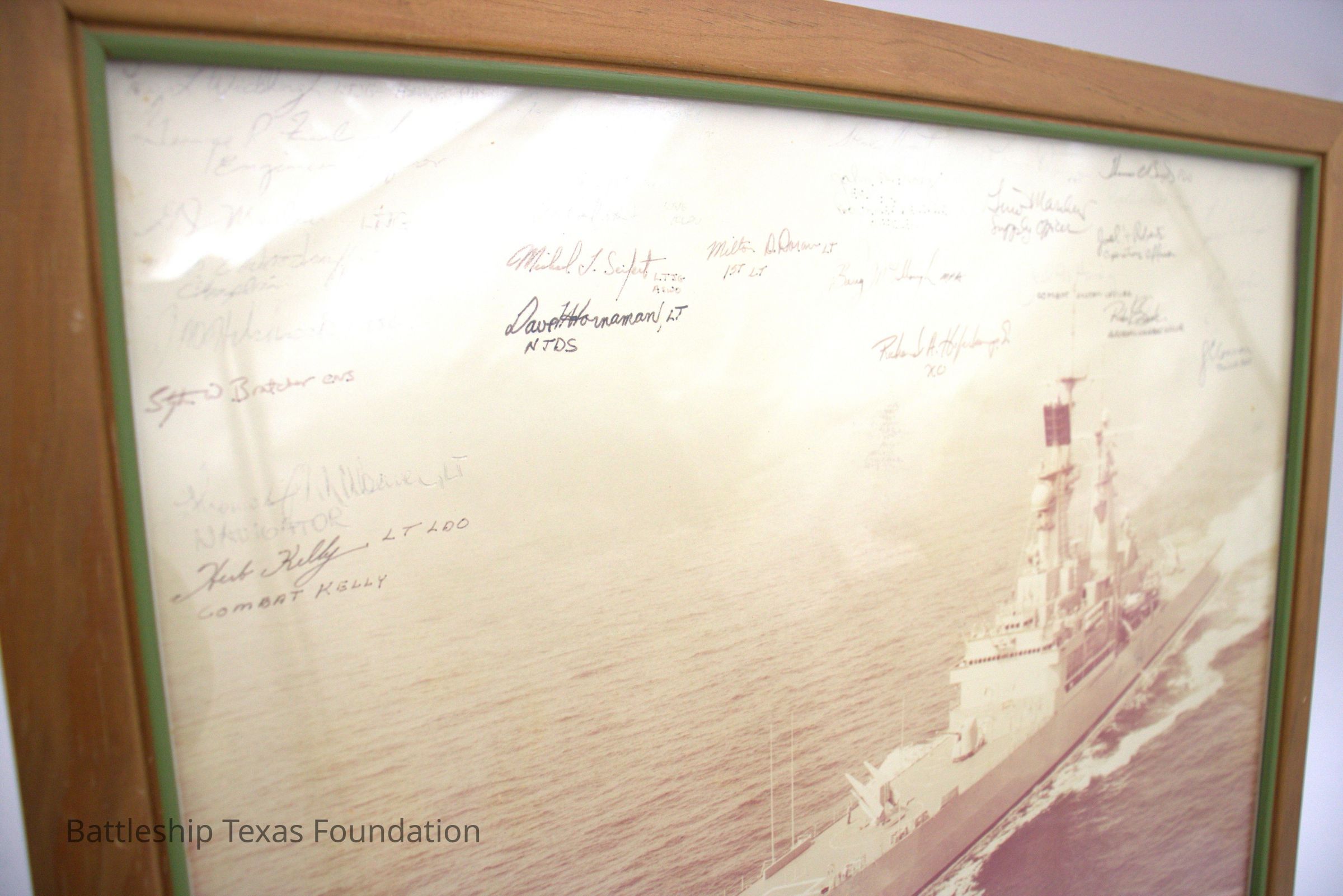 Large photograph of Cruiser Texas in wooden frame. Officers signed the top portion of the photo.Context