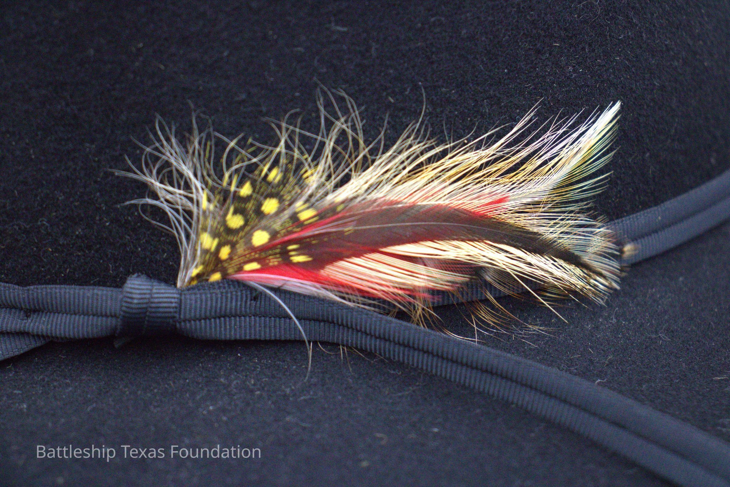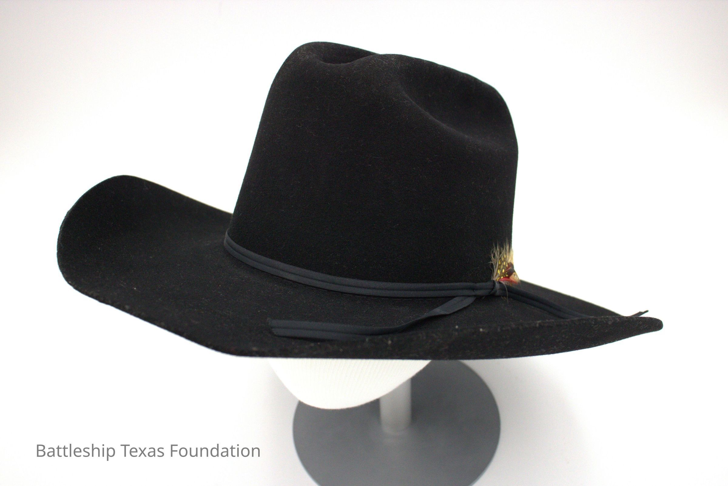 Black cowboy hat with a feather on the right side, fastened by a black rope band. Bought by Peter Fiedler.Context
