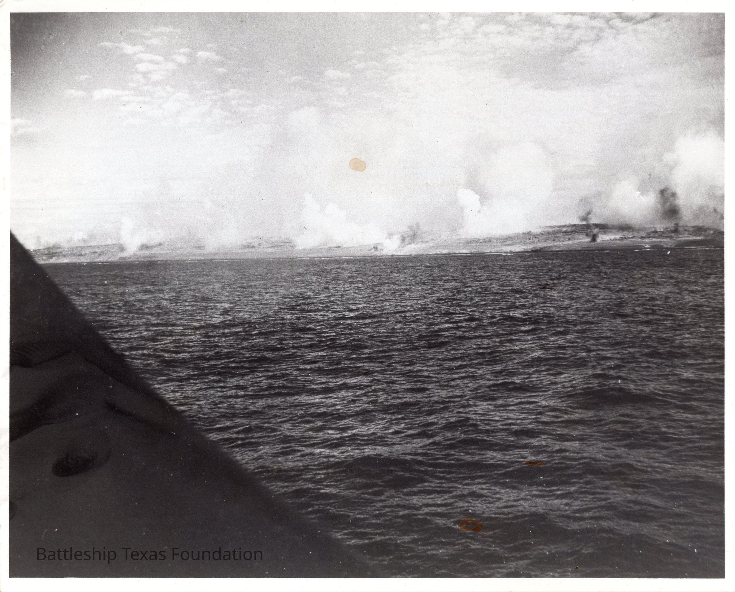 Smoking shore image taken from USS Capps (DD-550). Small brown splotch on center above shoreline. DD-550 screened Texas and other battleships out of frame during later days of Battle of Iwo Jima.Context