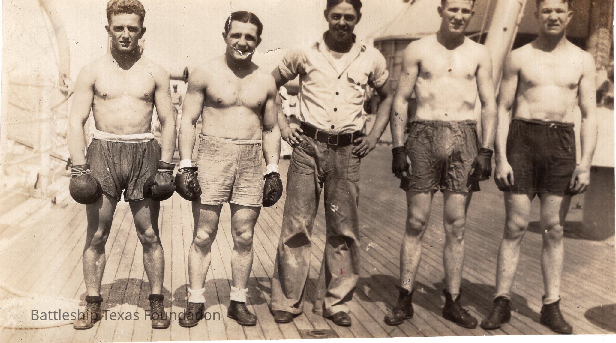 Features five men, four of which are boxers, standing on the deck of Texas.Context