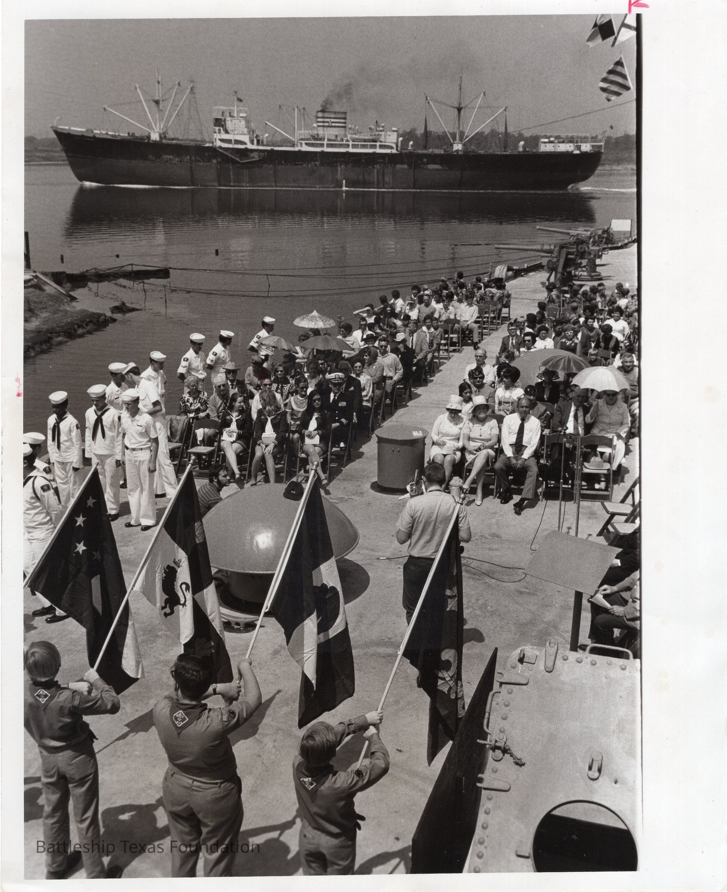 Scouts holding flags in front of large crowd. Ship in background.Context