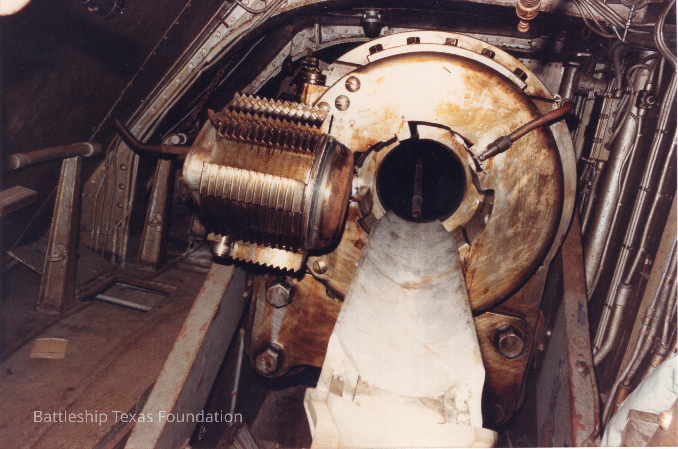 The left gun in turret two, breech open. Cosmoline preservative still present on the guns.Context