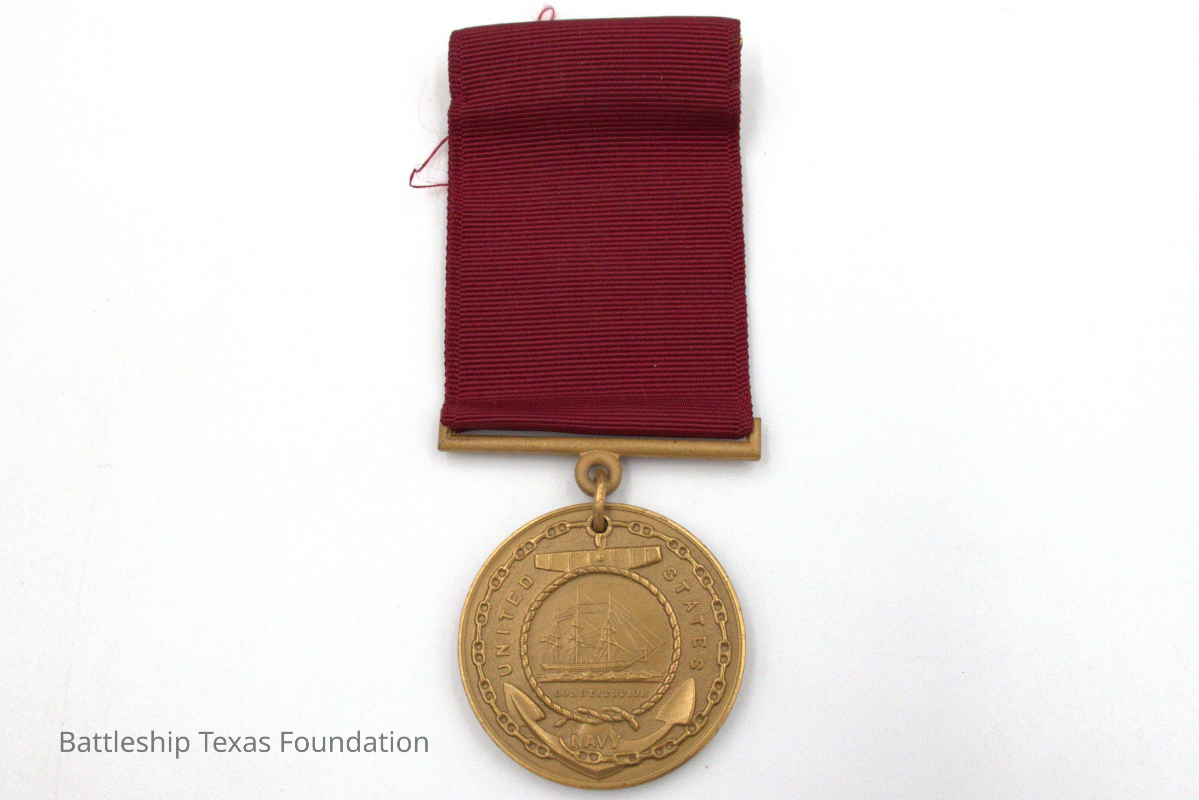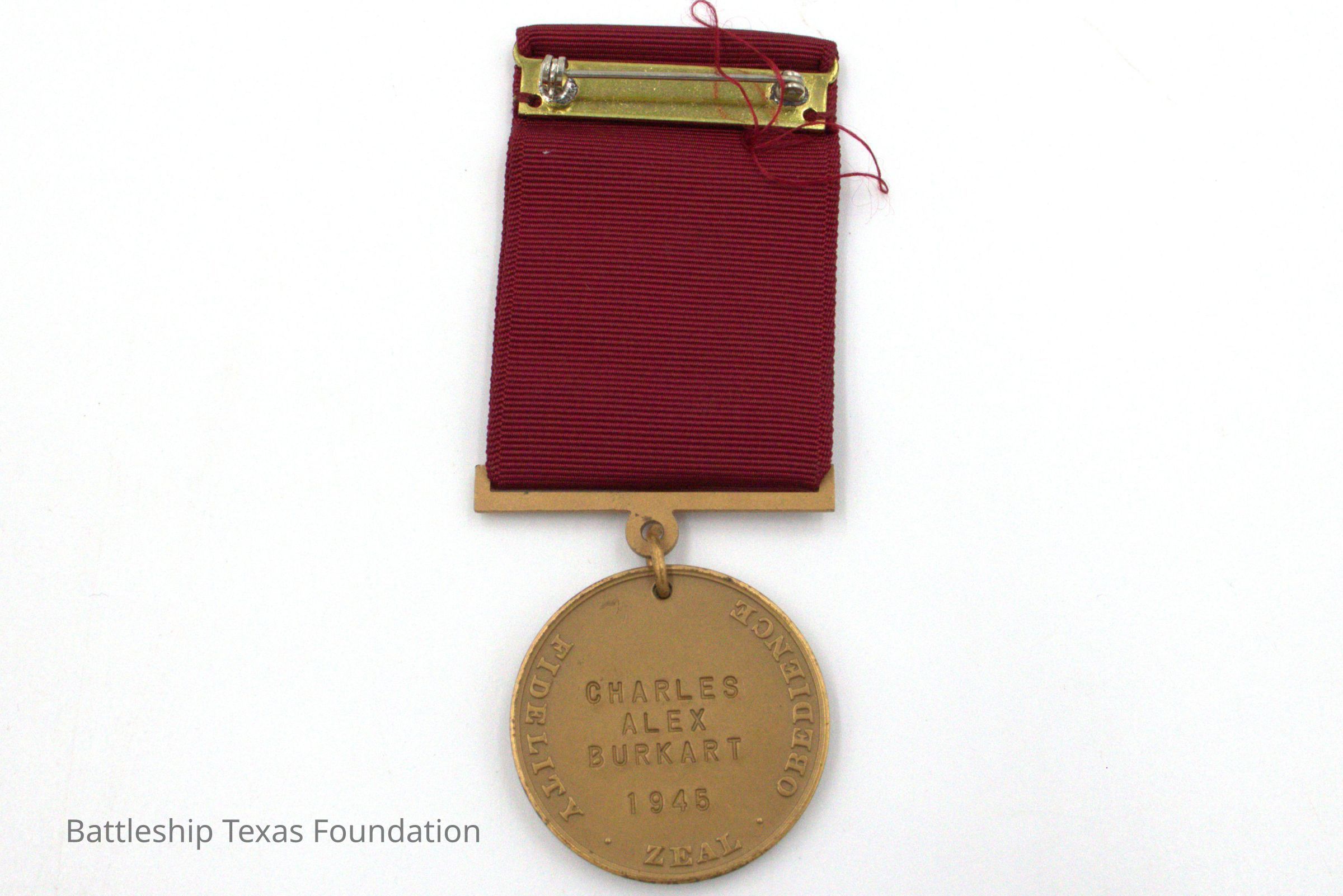 Medal belonging to Charles Alek Burkart issued in 1945. Reb fabric. USS Constitution circled by rope.Context
