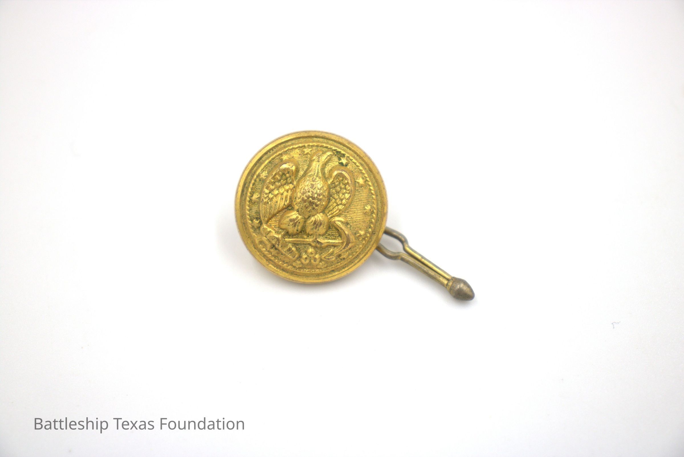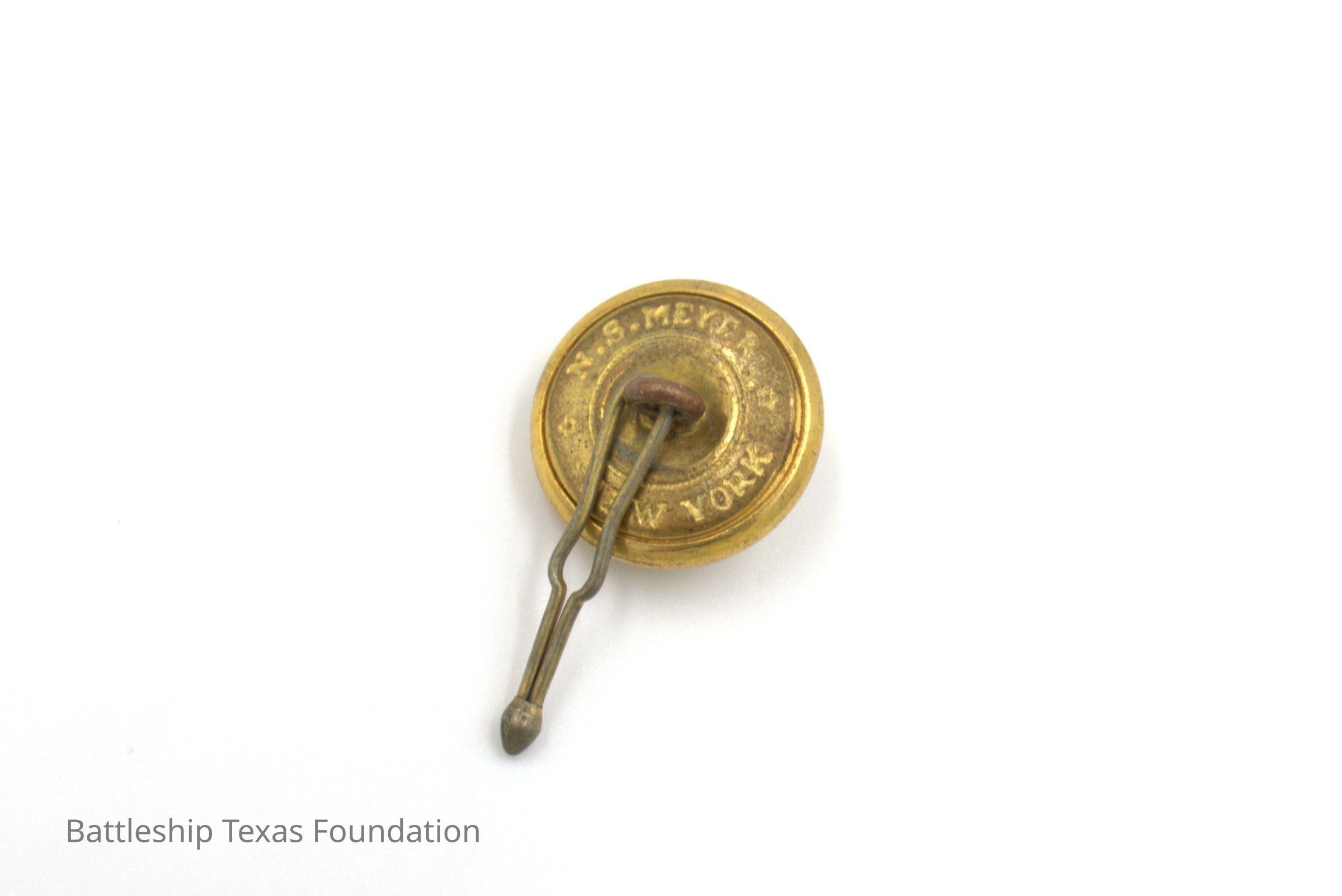 One of fifty-two individual gold buttons owned by Charles R. Pratt as spares for his USN overcoats. Button features an eagle perched on an anchor on the front. Button made by N.S. Meyers in New York.
