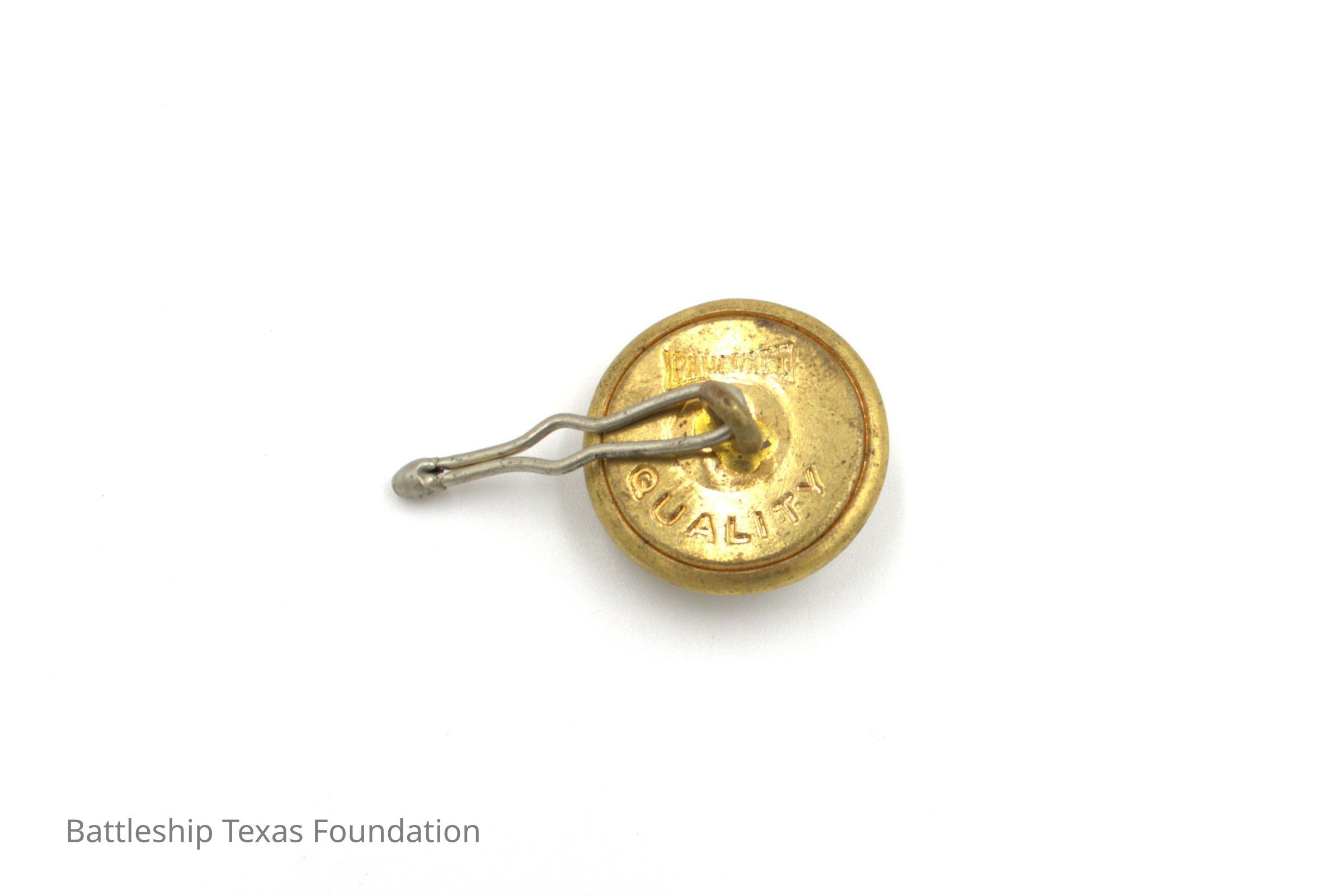 One of fifty-two individual gold buttons owned by Charles R. Pratt as spares for his USN overcoats. Button features an eagle perched on an anchor on the front. Button made by Pamcraft Quality.