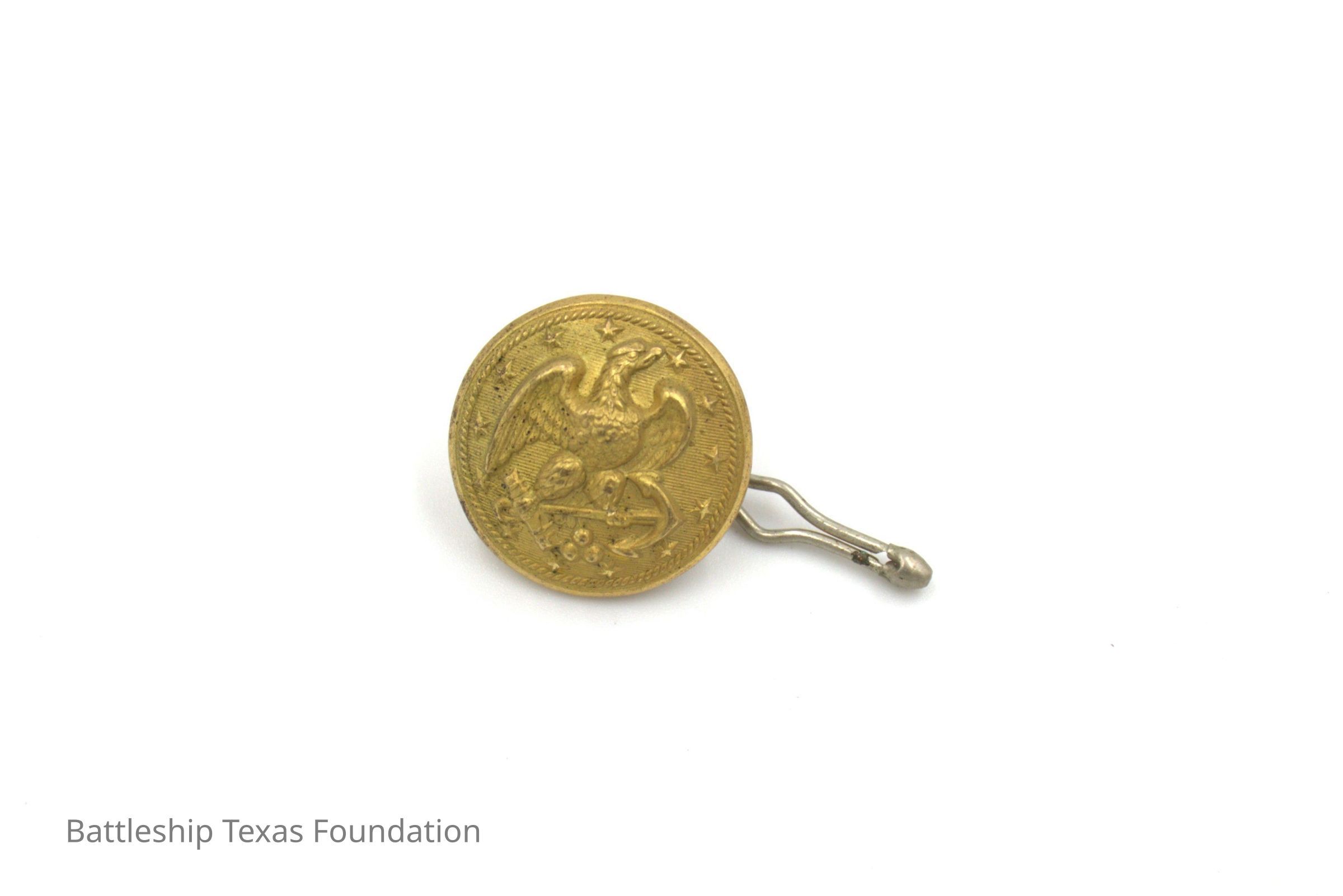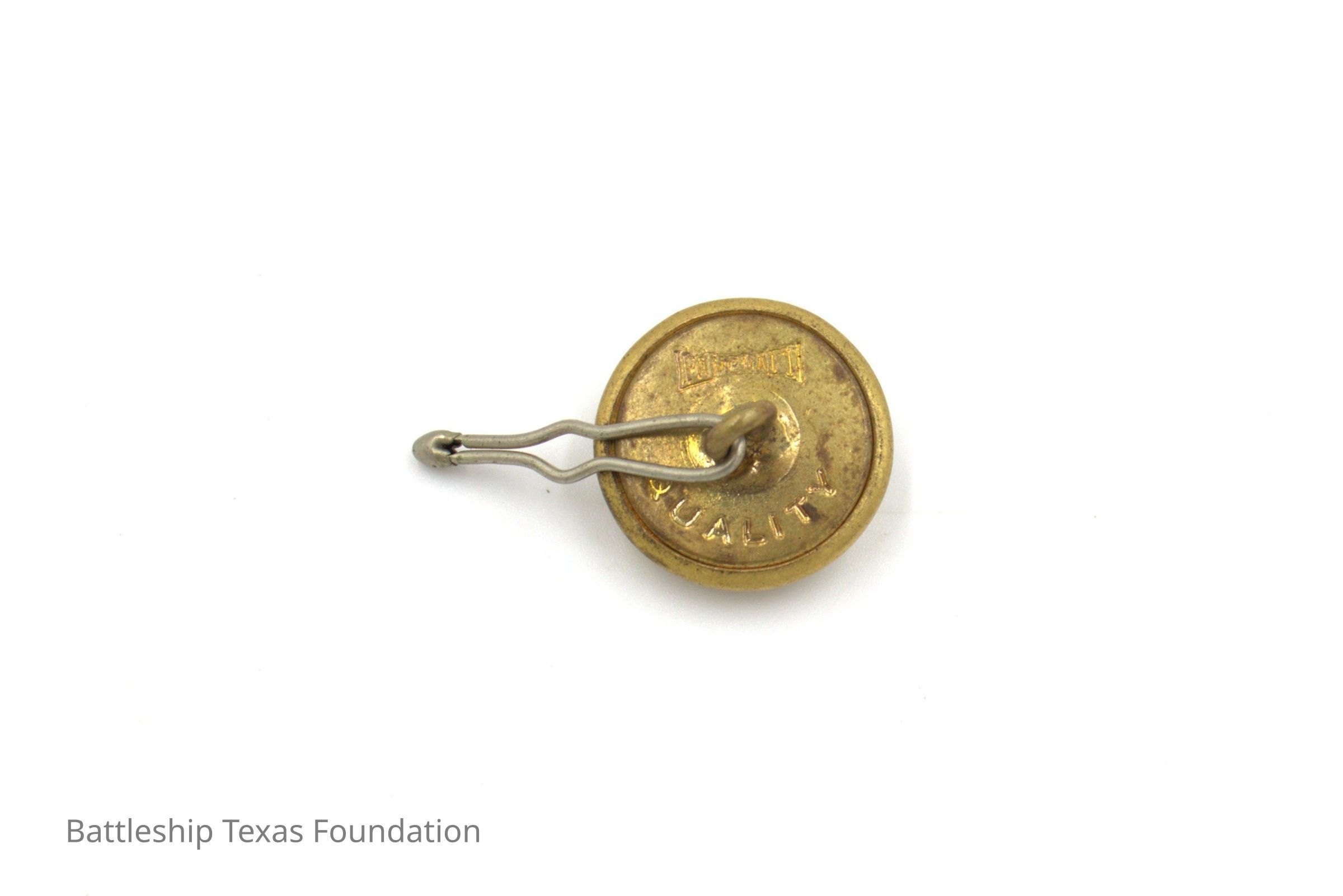 One of fifty-two individual gold buttons owned by Charles R. Pratt as spares for his USN overcoats. Button features an eagle perched on an anchor on the front. Button made by Pamcraft Quality.